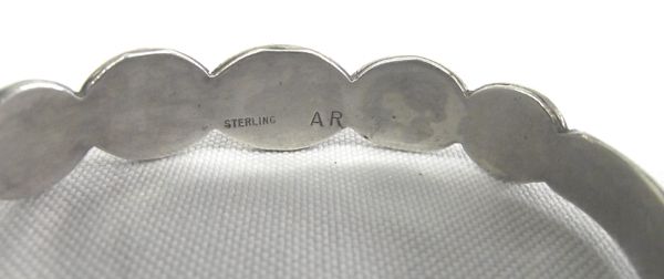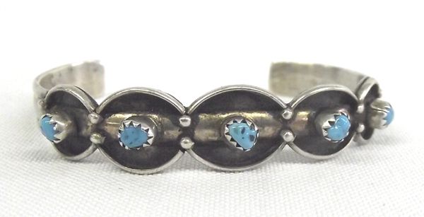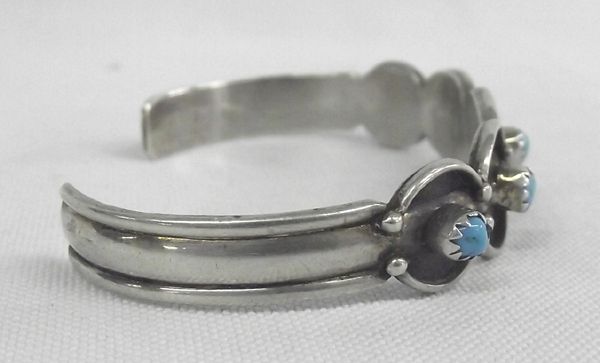 Zuni Sterling Turquoise Shadowbox Style Bracelet, hallmarked AR and stamped sterling, features 6 small turquoise cabochons, single band bracelet