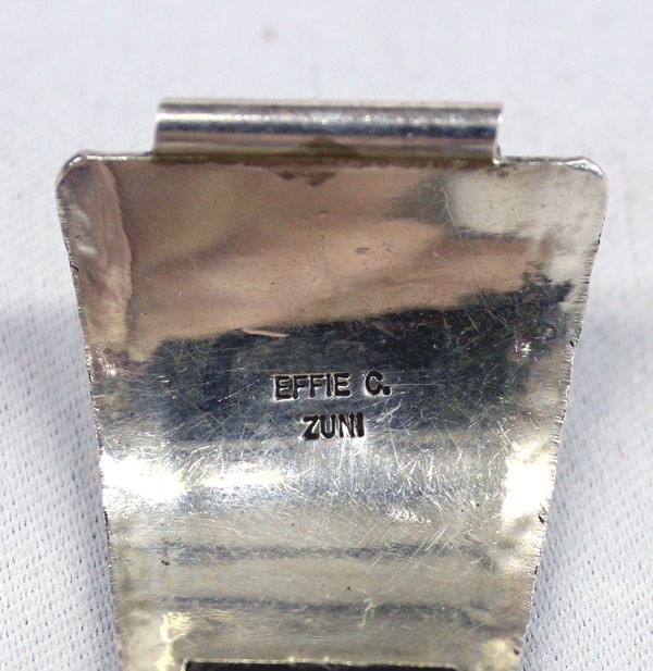 Zuni Sterling Turquoise Watchband - Effie Calavaza (1928-present), measures 5 5/8''L x 1''W, features 4 scalloped bezel set turquoise cabochons with the largest measuring .5'' x 3/8'', both tips are signed Effie C. Zuni, 41.34g in total wt. Artist Bio: Well known for her distinctive silver snake and turquoise nugget design, Effie Calavaza started working in the mid-1950s. Learning from and working with her husband, Juan Calavaza, Effie has passed her design along to her daughters Georgiana Yatsatti, Gloria Jean Garcia and Susie Calavaza. At first, Effie and her husband signed their work together with JUAN C.-ZUNI . Later, she and her daughters all signed their work with EFFIE C.-ZUNI.