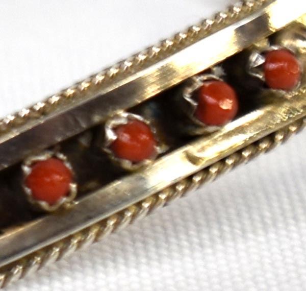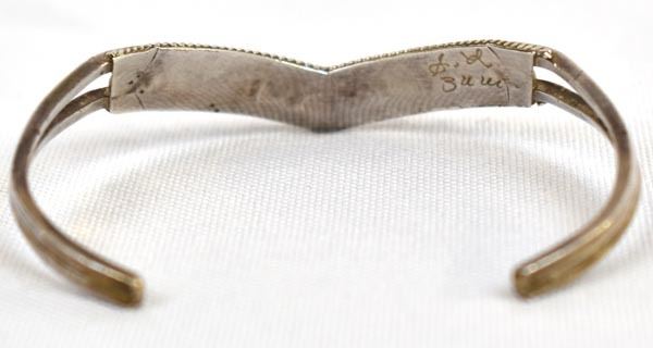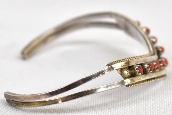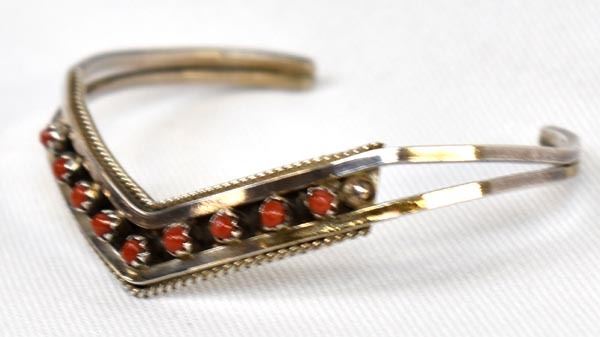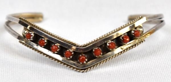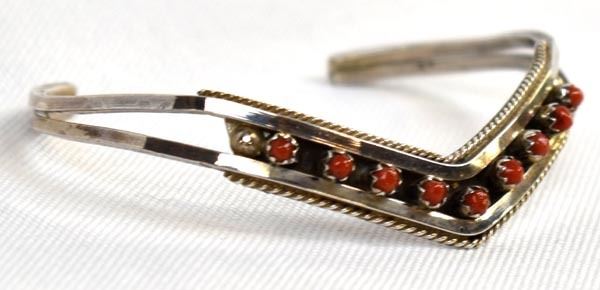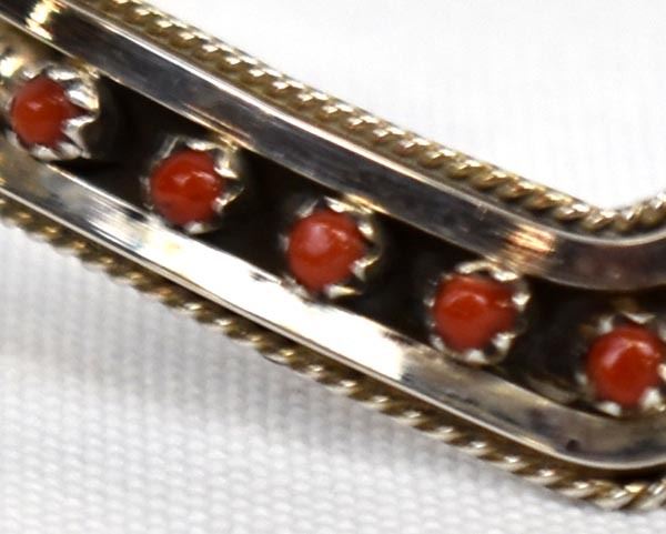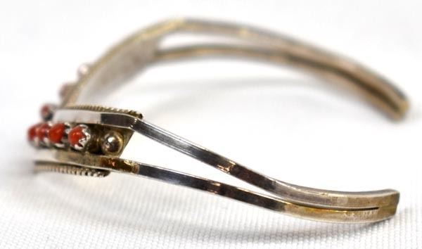 Native American Zuni Sterling and Coral Bracelet by Sue Leekity, inside measures 5'' which includes the gap x .25''W, engraved initials on back and ''Zuni''