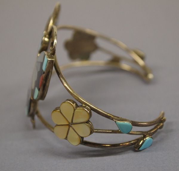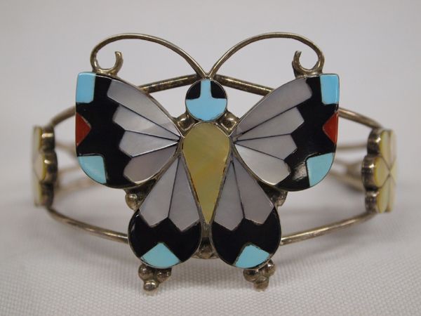 Zuni Stone to Stone Inlay Sterling Bracelet - Allison Dishta, signed A. Dishta Zuni Sterling, stunning inlay work of onyx, mother of pearl, turquoise, coral, yellow mother of pearl butterfly design accented by two yellow mother of pearl flowers and 4 tear drop shaped turquoise cabochon leaves, inside measures 6.75'' inside including gap x 1.75''W, 2 band bracelet, Stunning!