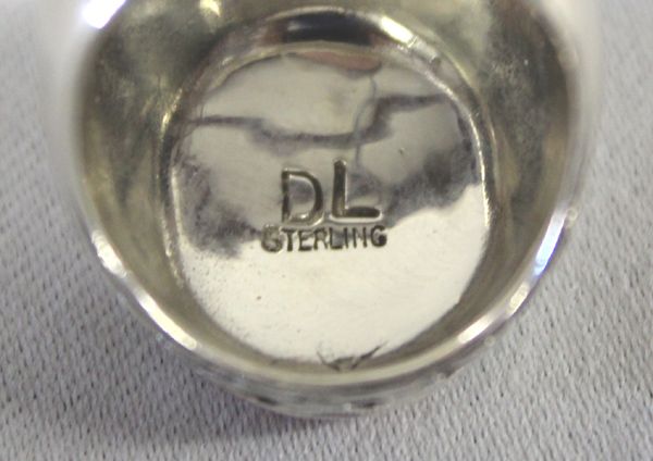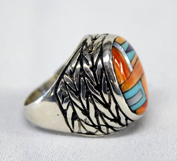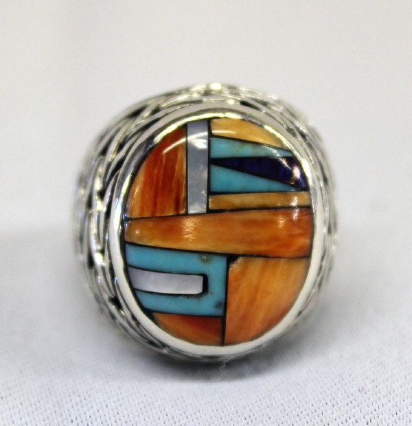 Native American Zuni Stone-to-Stone Sterling Ring, Signed. Silver chevron braid patterns surround the shank of the ring with the oval stone setting of red shell, lapis, turquoise, mother-of-pearl all set stone-to-stone. Hallmark ''DL'' and stamped ''Sterling''.