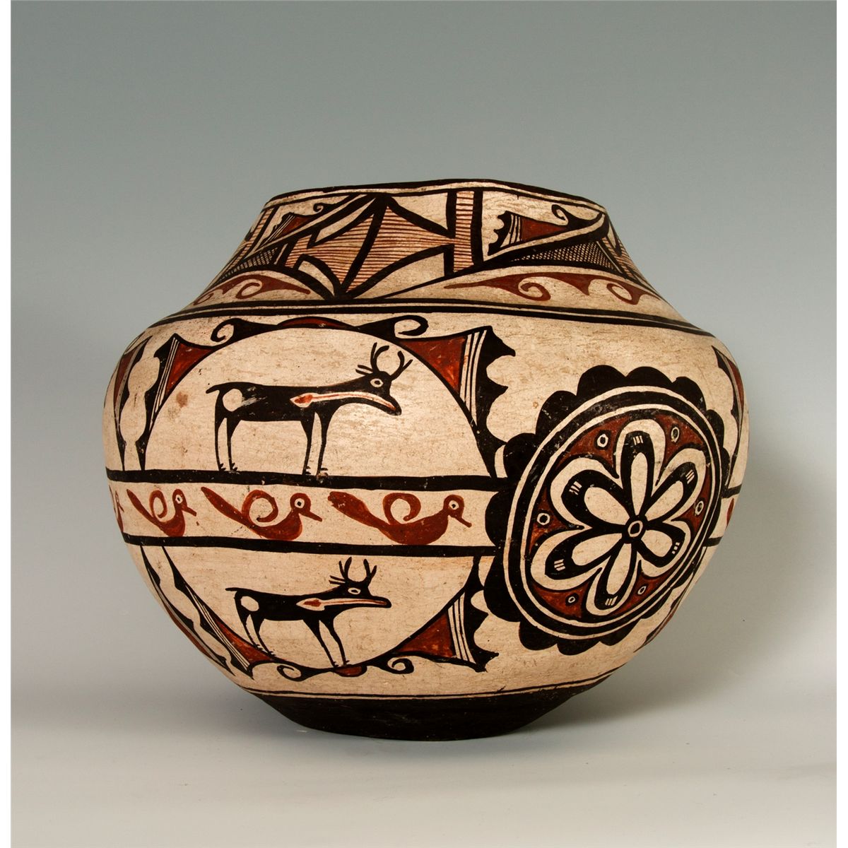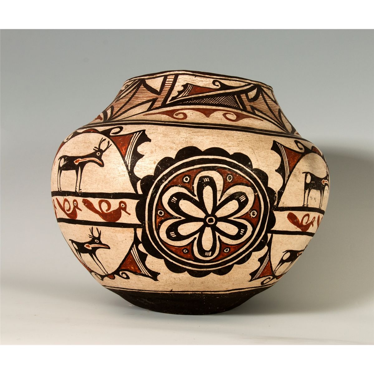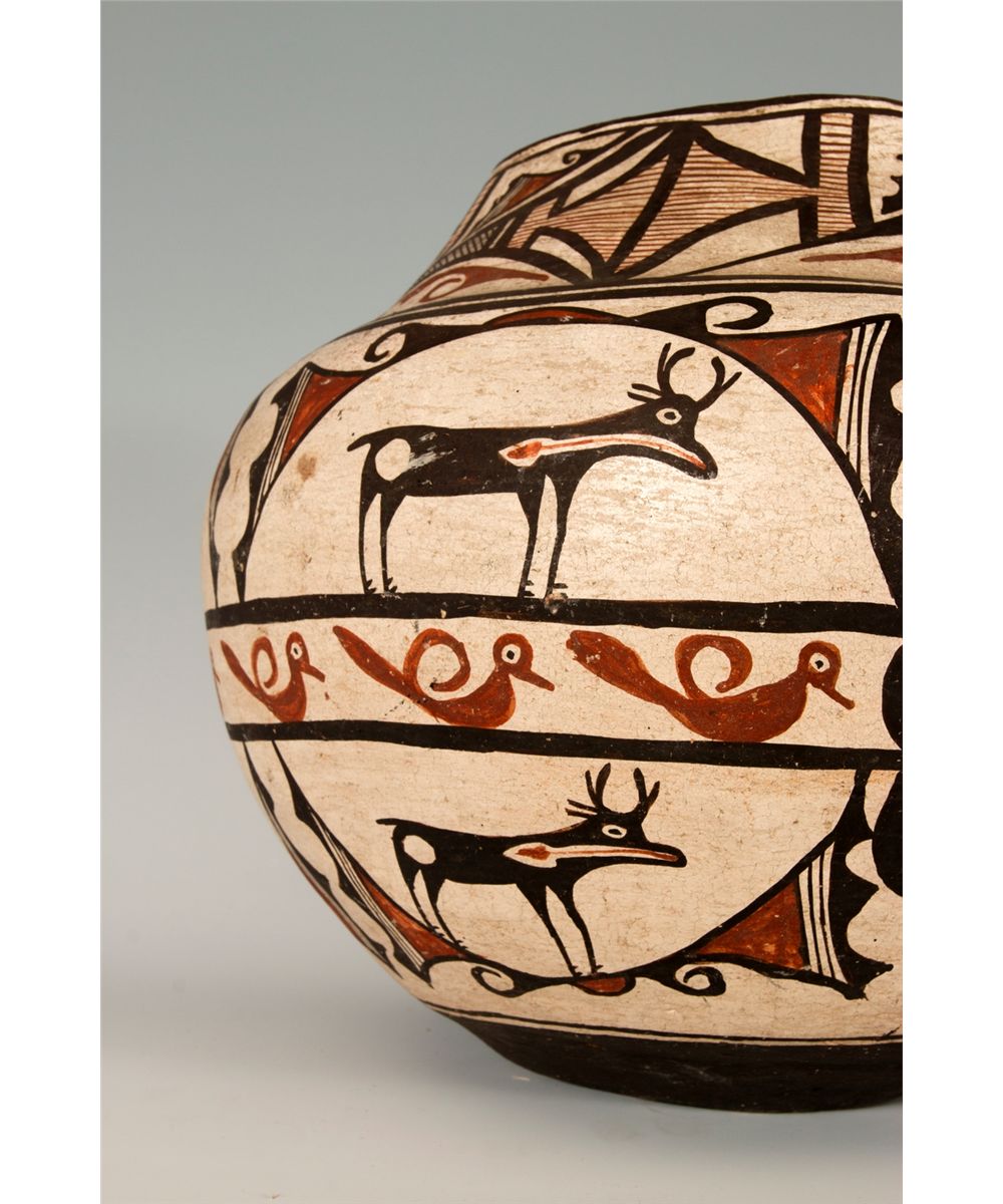 Zuni Storage Jar. 11" tall, 14" diameter. Polychrome designs with heart-line deer surrounded by solid and hatched geometric designs, florals and birds. Circa 1890.