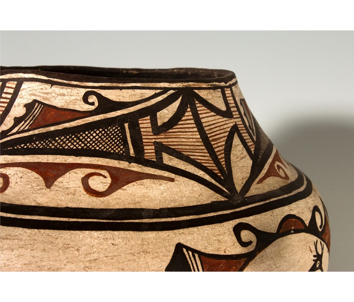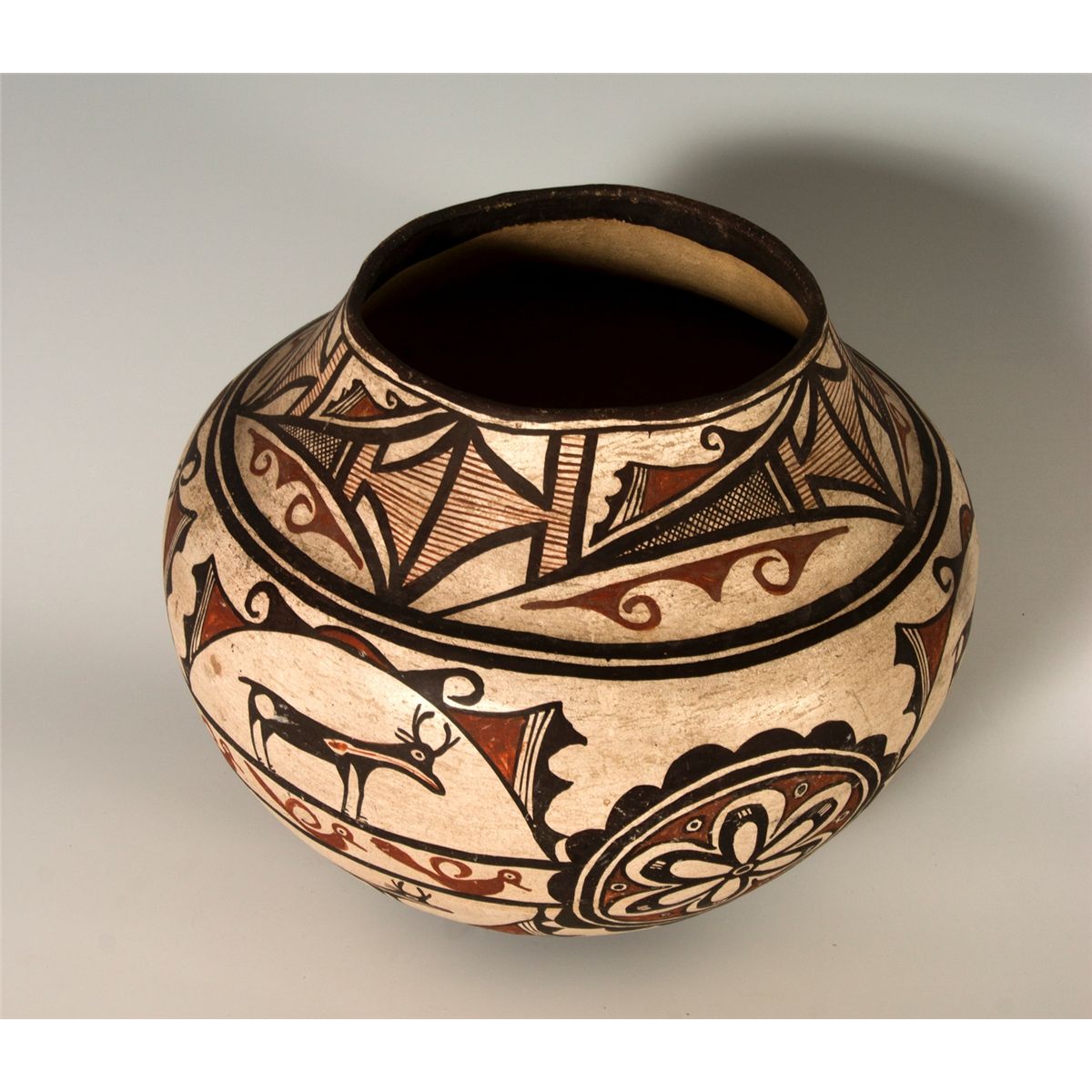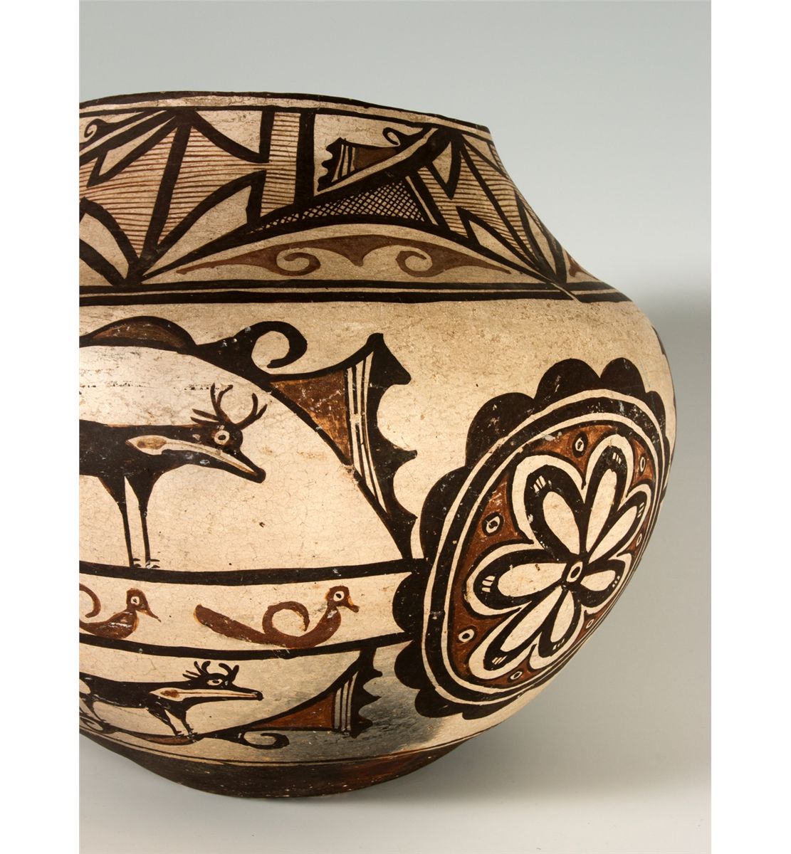 Zuni Storage Jar. 11" tall, 14" diameter. Polychrome designs with heart-line deer surrounded by solid and hatched geometric designs, florals and birds. Circa 1890.