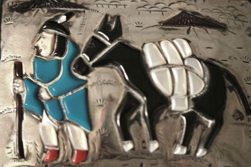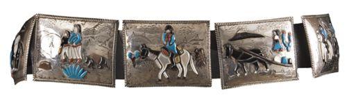 Zuni Story Belt. Nine conchos 3 1/2" x 3" with matching belt buckle. Each concho shows stone inlay in silver concho. Signed J.M. Fabulous work. (est $3,000-4,000)