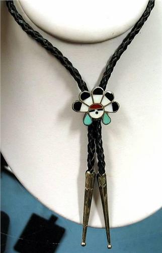 Zuni Sun Face Headdress bolo with tips. Sunface measures 1 1/2" across and is 1" tall