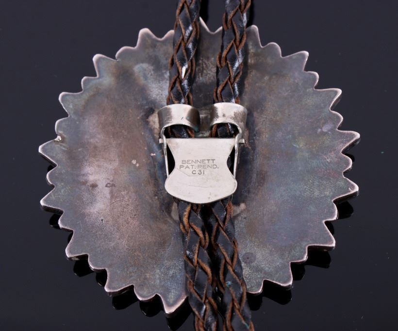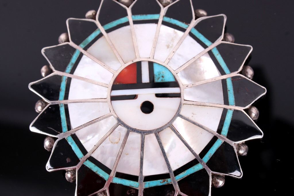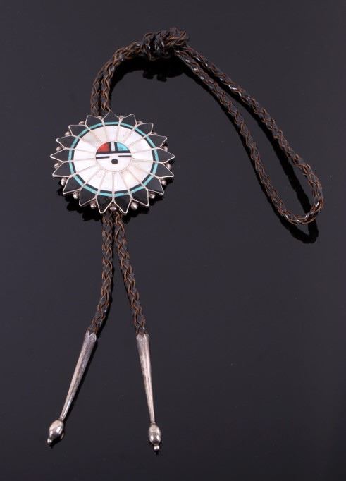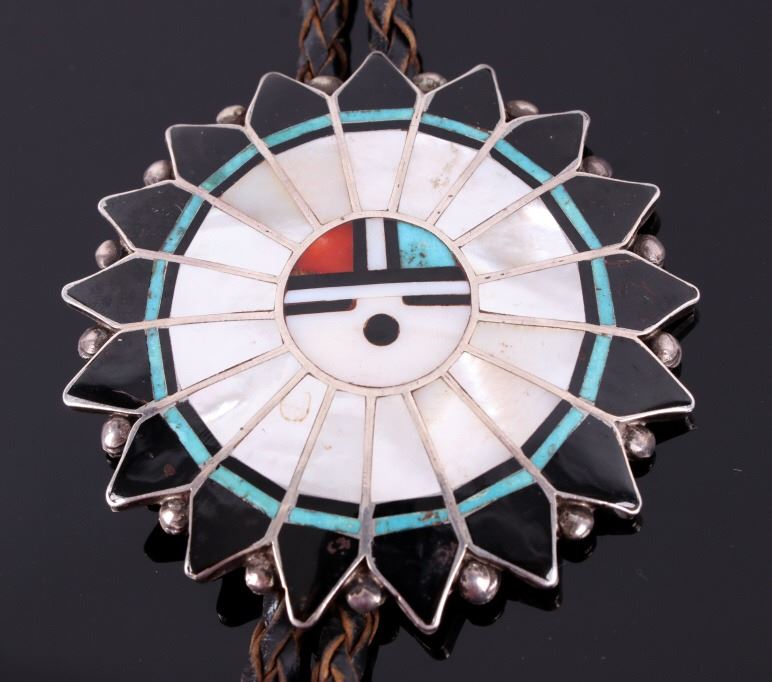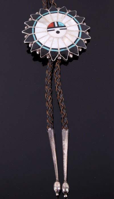 For your consideration is a Zuni Native American Sun Face silver bolo tie. This tie is constructed of black braided leather with sterling silver aglet tips. The bolo is a fantastic example of Zuni craftsmanship. The image depicts an intricately inlaid onyx, turquoise, mother of pearl and branch coral design with silver bead accents. The design represents the sacred Sun Father. The Zuni have always honored the Sun’s vital role in the cycling of seasons and the success of crops, recognizing that the Sun’s warmth sustains life, enables growth, and brings joy and prosperity to the people. The symbol’s round motif depicts the Sun with a forehead split down the middle to reflect the eternal balance between sunrise and sunset. Rectangular eyes and a round mouth complete the face, and the whole is encircled by feathers that radiate outward like sunlight. The gems are set on a sterling silver backing. The bolo measures 2 3/4" round.