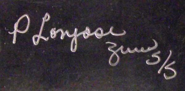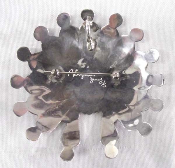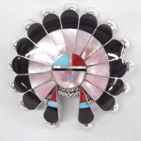 Native American Zuni Sun God Channel Inlay & Silver Pin/Pendant. Magnificent piece of Zuni channel inlay work, using jet, turquoise, pink mother-of-pearl and red shell. The feather headdress of the sun god has silver beads which accentuate the design to perfection! It is signed by ''P. Lonjose''', for Pauline Lonjose' and ''Zuni''. It measures 3'' in diameter. If you're looking for a Zuni piece of inlay work, this is it!