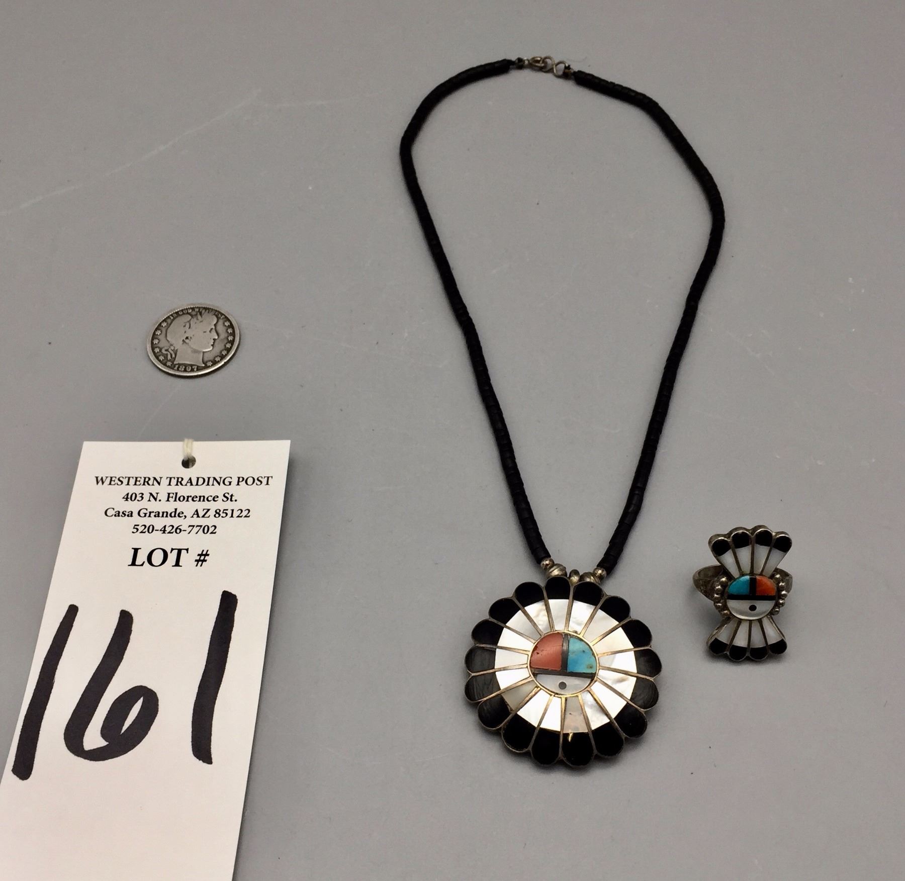 Maker: Unmarked, Zuni. Approx. Age: Vintage (Circa 1970s). Size: Fits 15 1/2” around the neck, pendant is 1 5/8” wide and dangles 1 3/4”. Ring is size 6 1/2 and 1 1/4” at it’s widest. Lot weighs 24.3 g. Additional Info: Nice mother of pearl, onyx, turquoise and coral inlay set in sterling silver. Pendant is on a necklace made of dark penn shell beads with sterling accents and findings. Condition: Good for their age, normal wear expected. Please look closely at the pictures - they are an important part of our description. Shipping: There will be a $5 handling / packaging fee for shipping this lot. The actual cost of postage will be added on top of that.