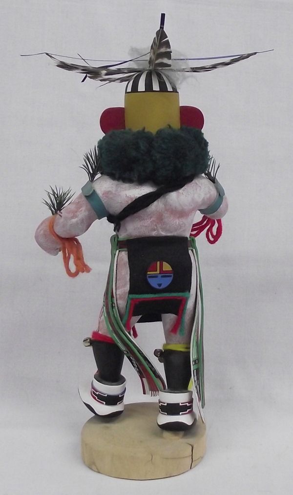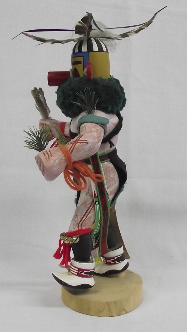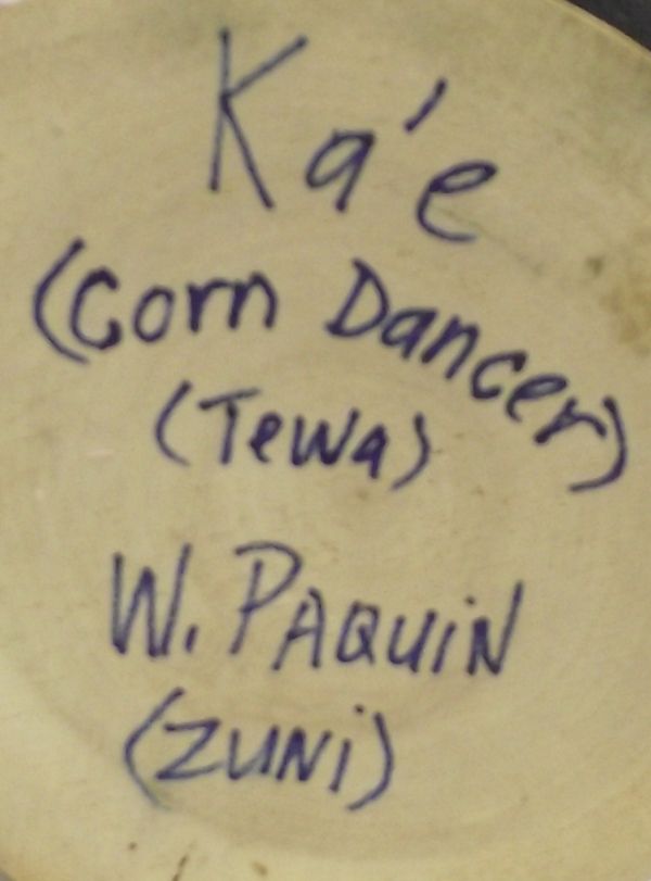 From the Collection of Nick & Suzanne Nicholas. Tewa Ka'e ''Corn Dancer'' Kachina Signed by Zuni artist W. Paquin. The corn Kachina is popular, common spirits because corn is a supreme Hopi food. In the dances they participate in, they function to aid corn production. This brightly painted and adorned kachina is decorated with bells, cloth and feathers. It stands approx. 14.5''H x 7.5''W and will look wonderful in your collection.