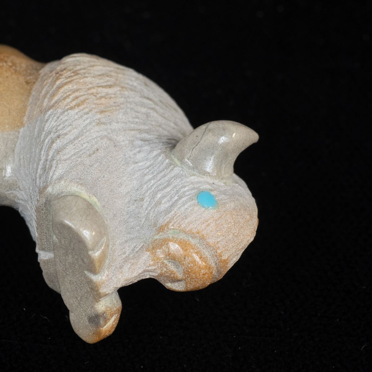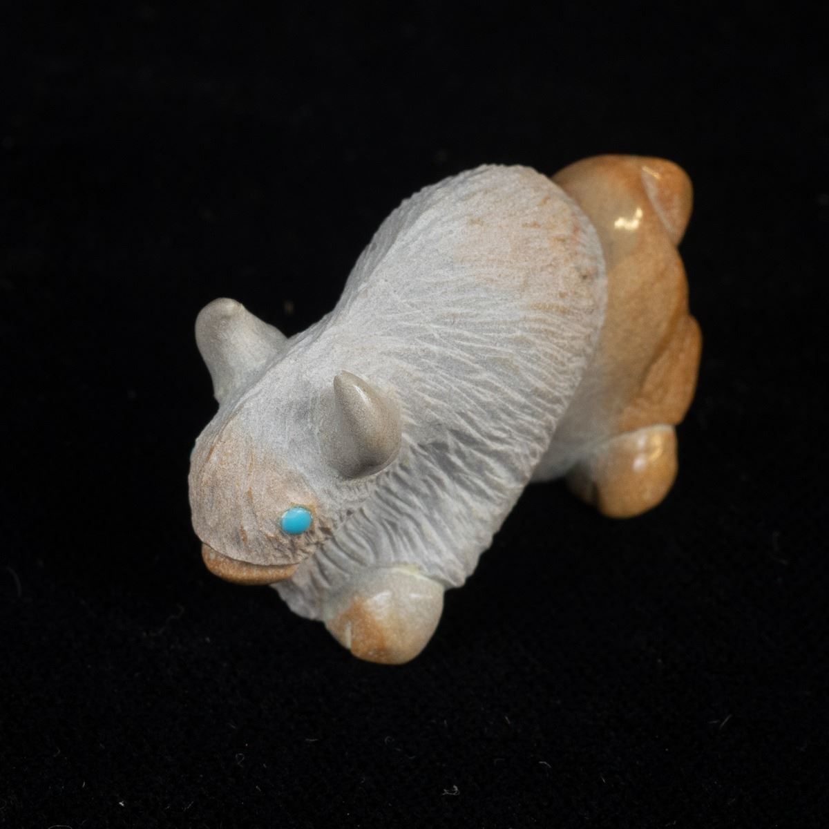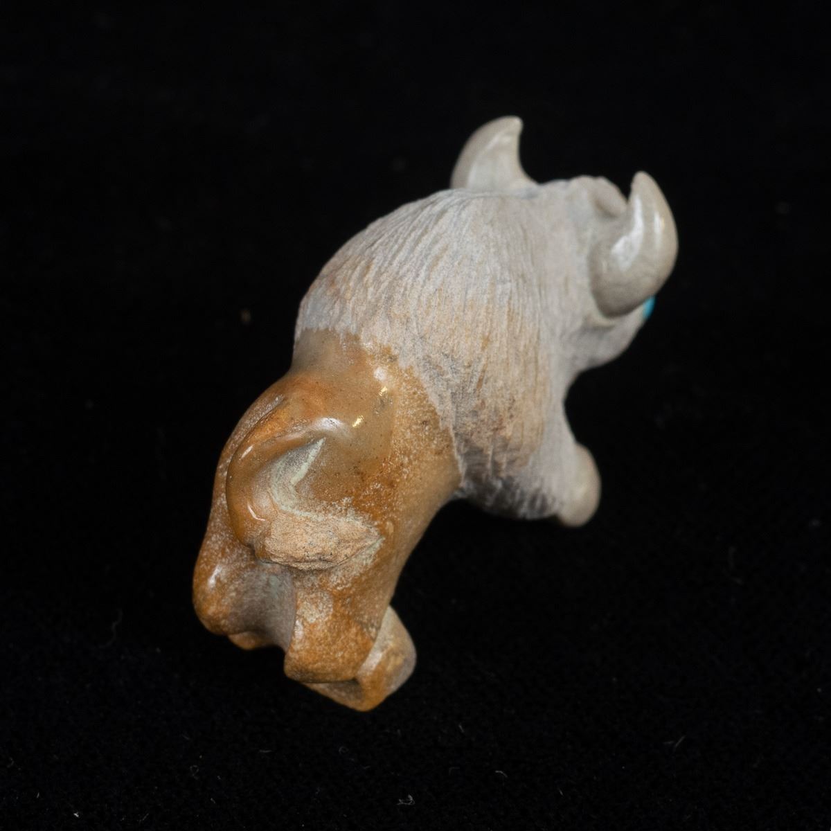 Native American Zuni Travertine Buffalo Fetish by Vince Chavez, measures .5'' x 1'' x 1.5'', turquoise eyes