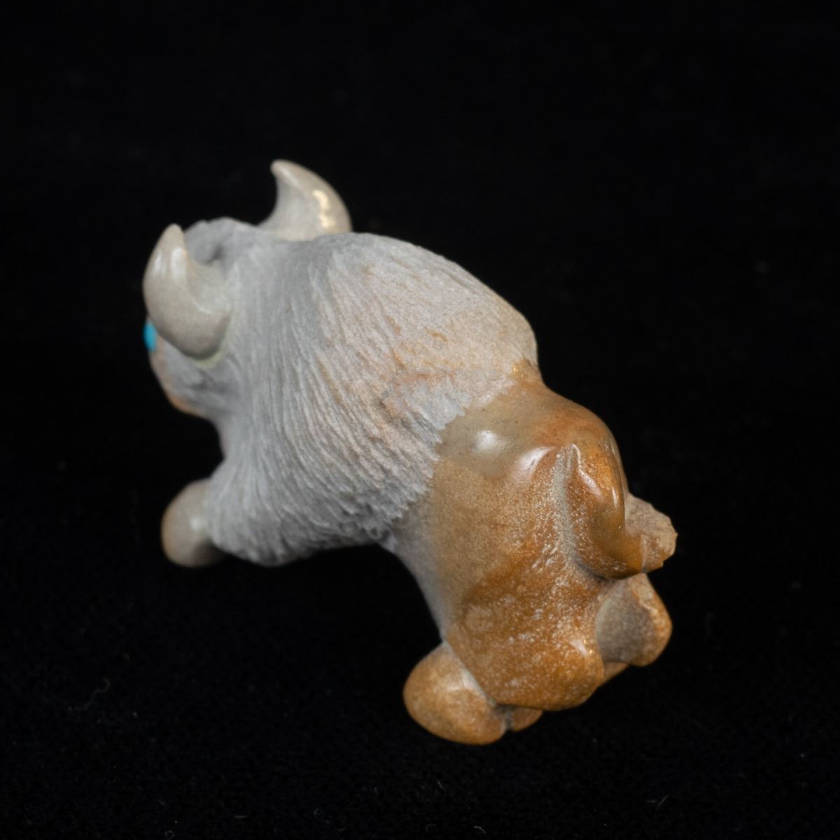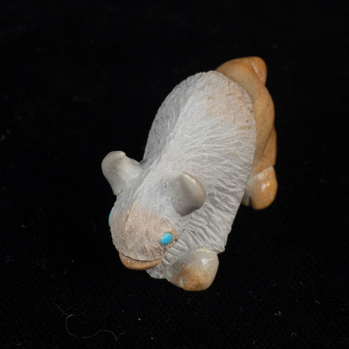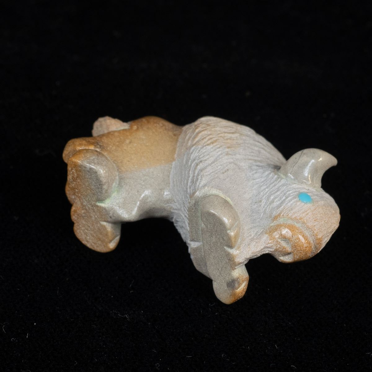 Native American Zuni Travertine Buffalo Fetish by Vince Chavez, measures .5'' x 1'' x 1.5'', turquoise eyes