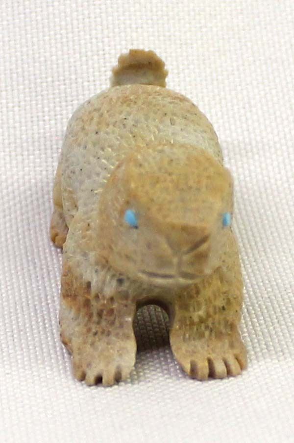 Native American Zuni Travertine Prairie Dog Fetish by Sedrick Banteah, measures .5'' x 1.5'' and has artist's intials on the bottom, turquoise eyes