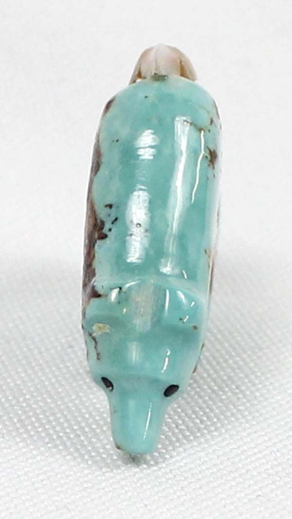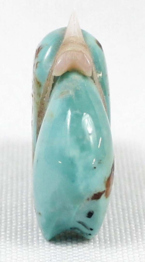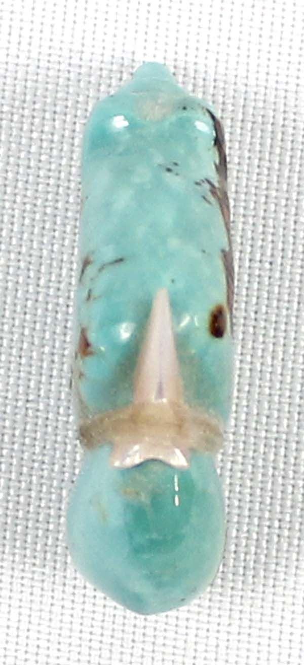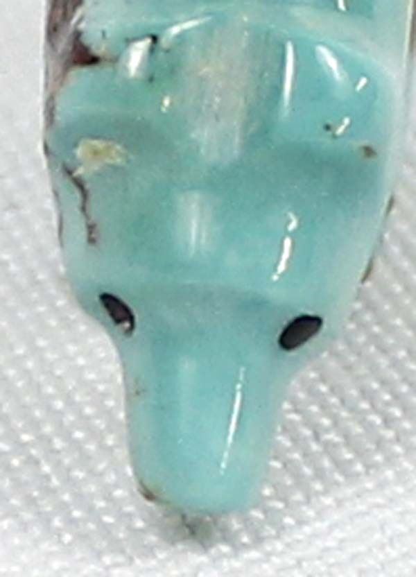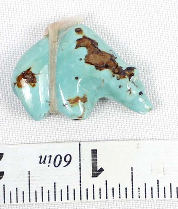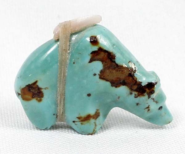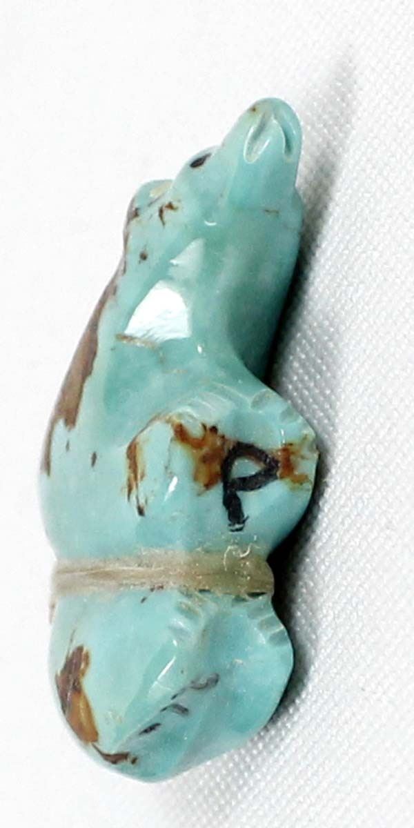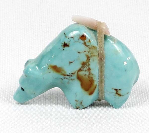 Native American Zuni Turquoise Bear Fetish by Emery Eriacho, measures 1.5'' x 1'' x .25'', jet eyes, carved arrowhead spirit bundle