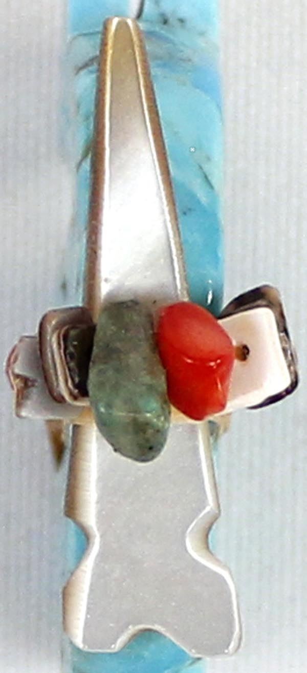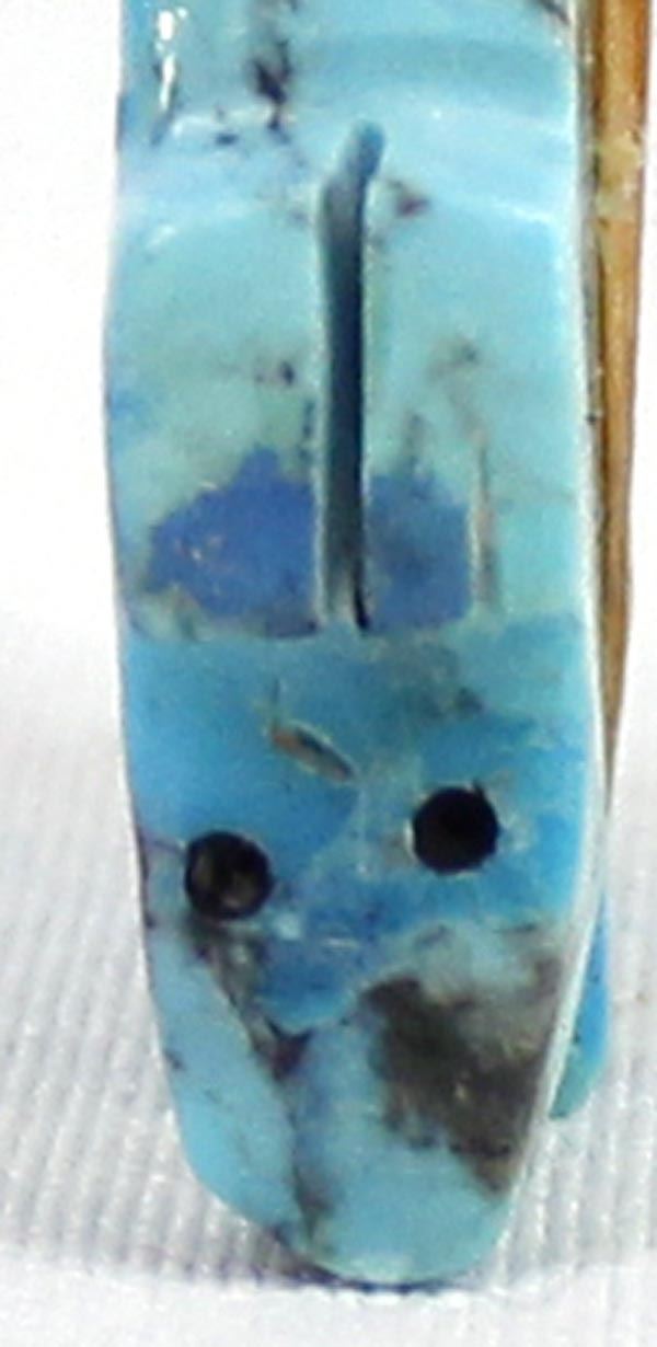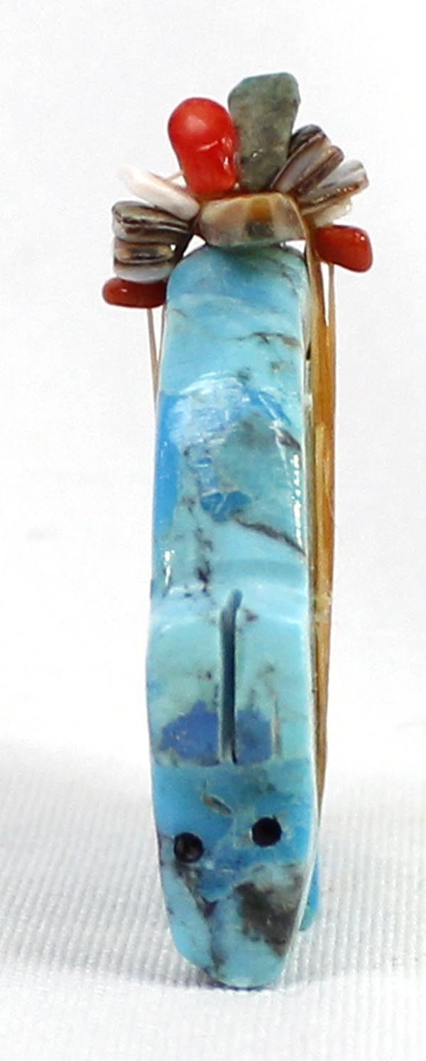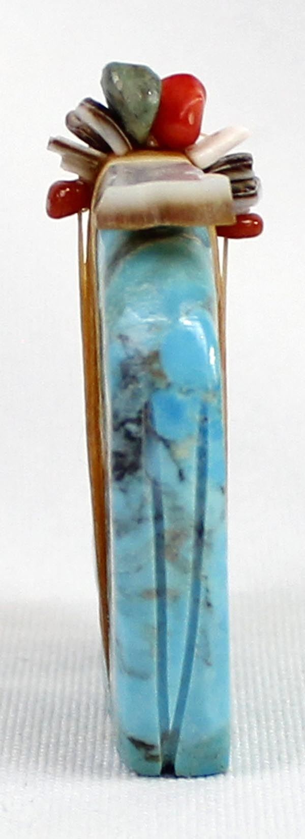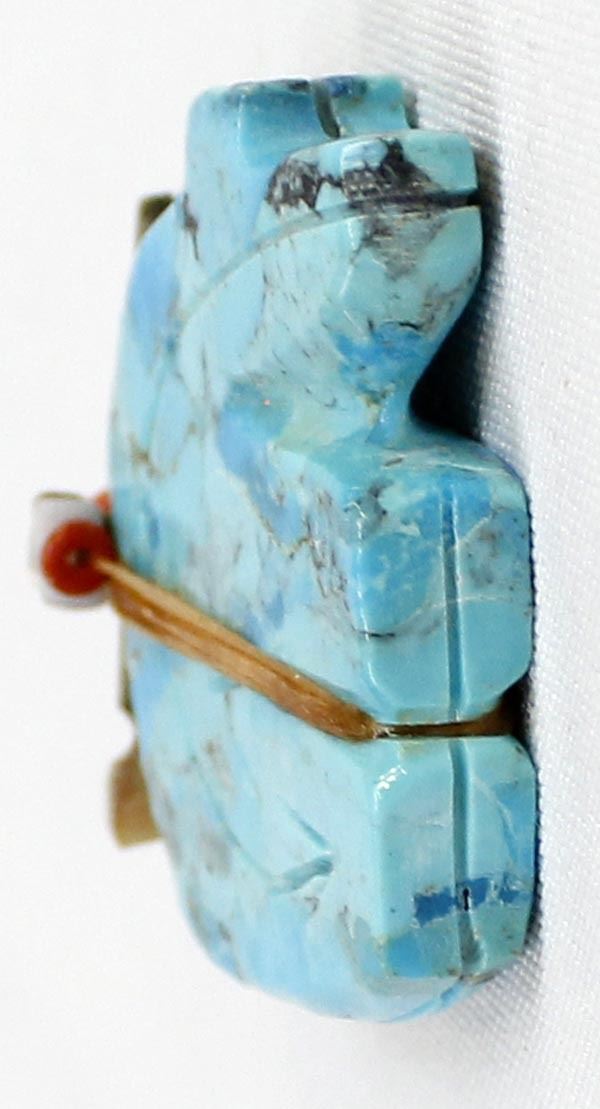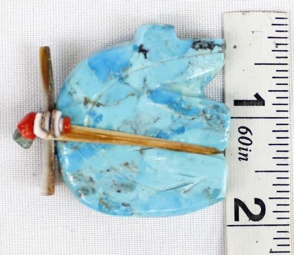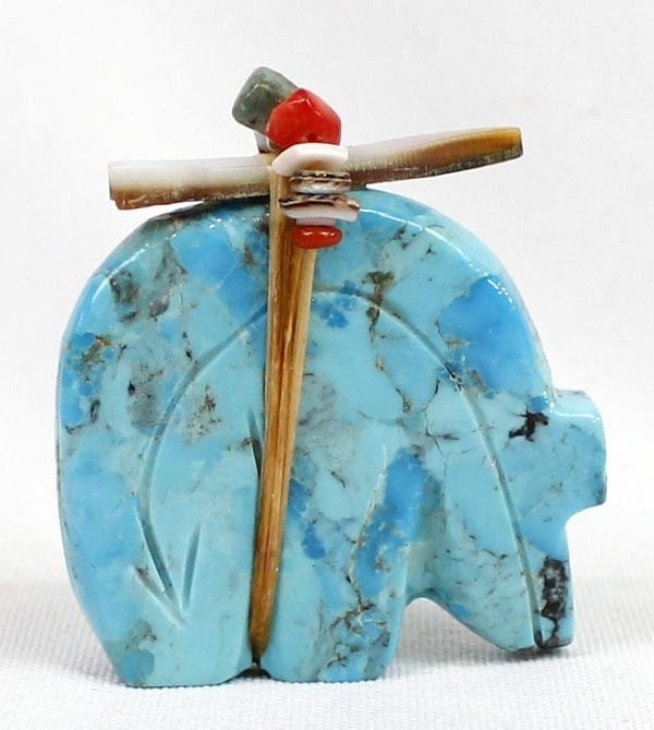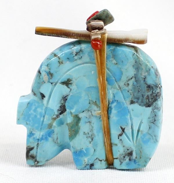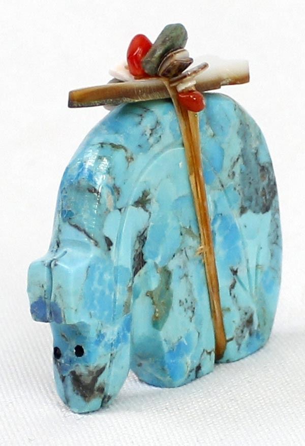 Zuni Turquoise Bear Fetish, abalone arrowhead spirit bundle embellished with turquoise, coral, and shell heishi beads, carved heartline, possible artist Everett Pino