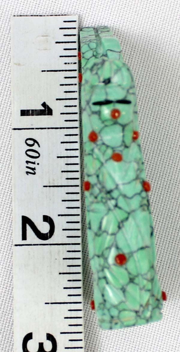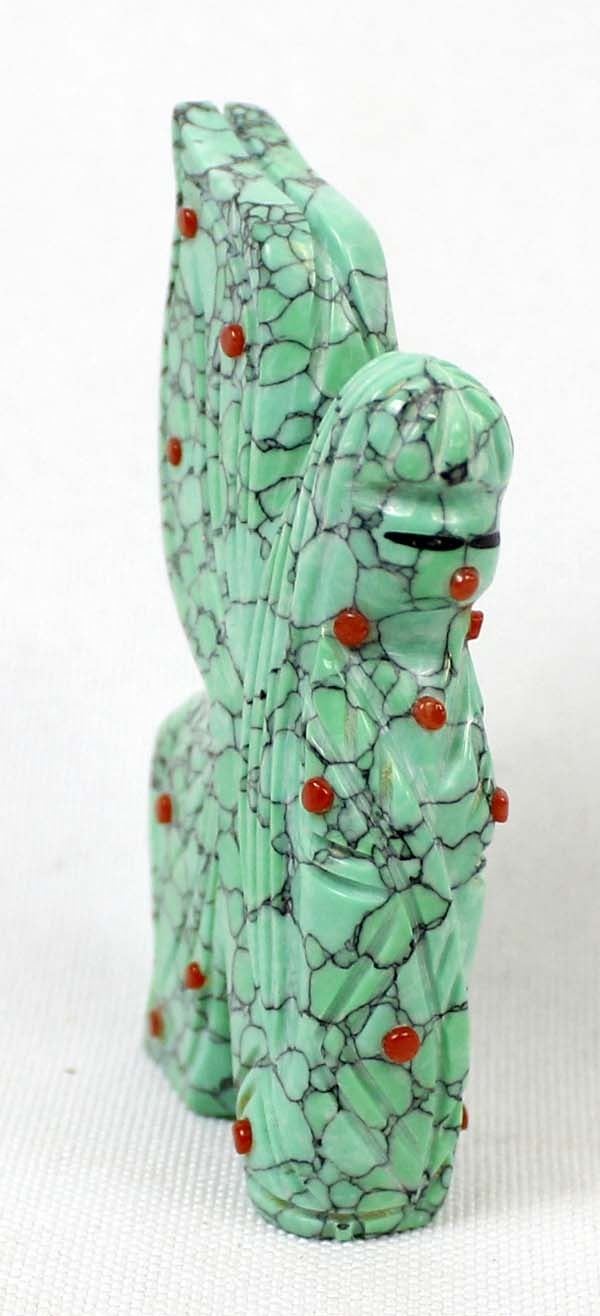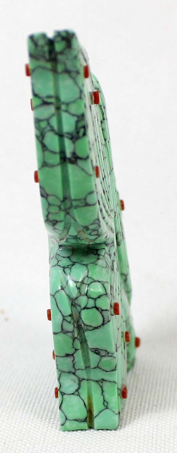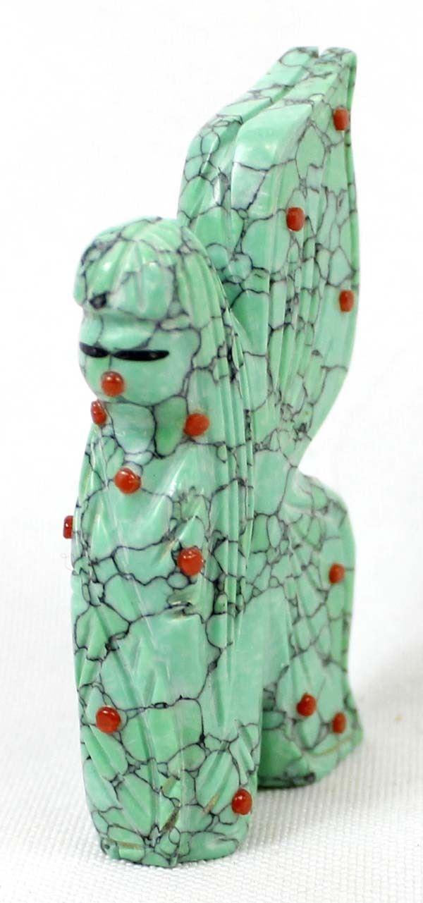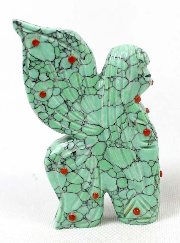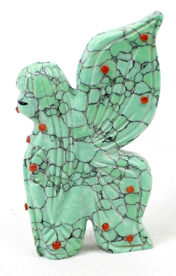 Native American Zuni Turquoise Butterfly Maiden Fetish by Michael Laweke, measures 1.5'' x 2'' x .5'', has artist's initials on the bottom, embellished with coral