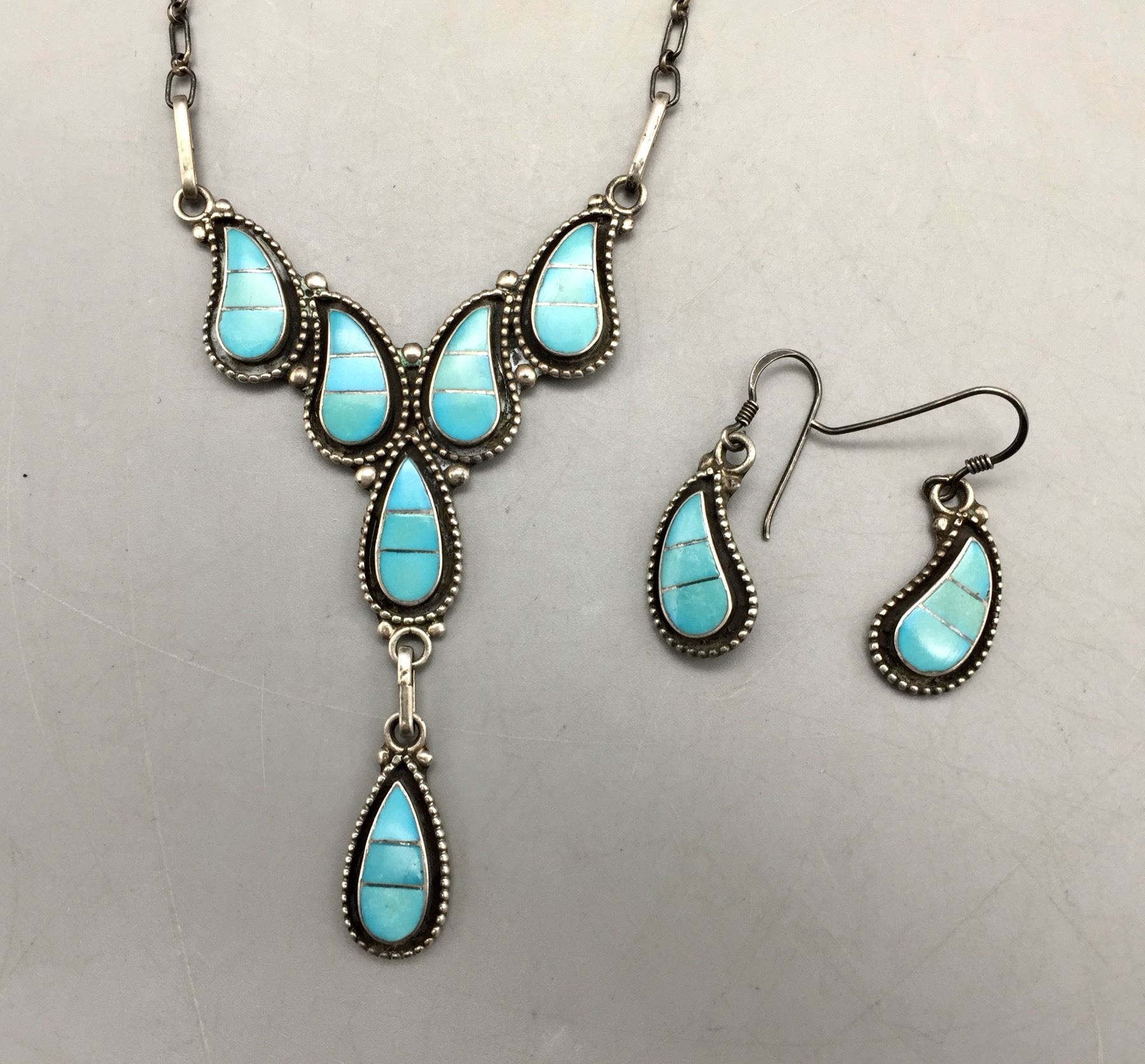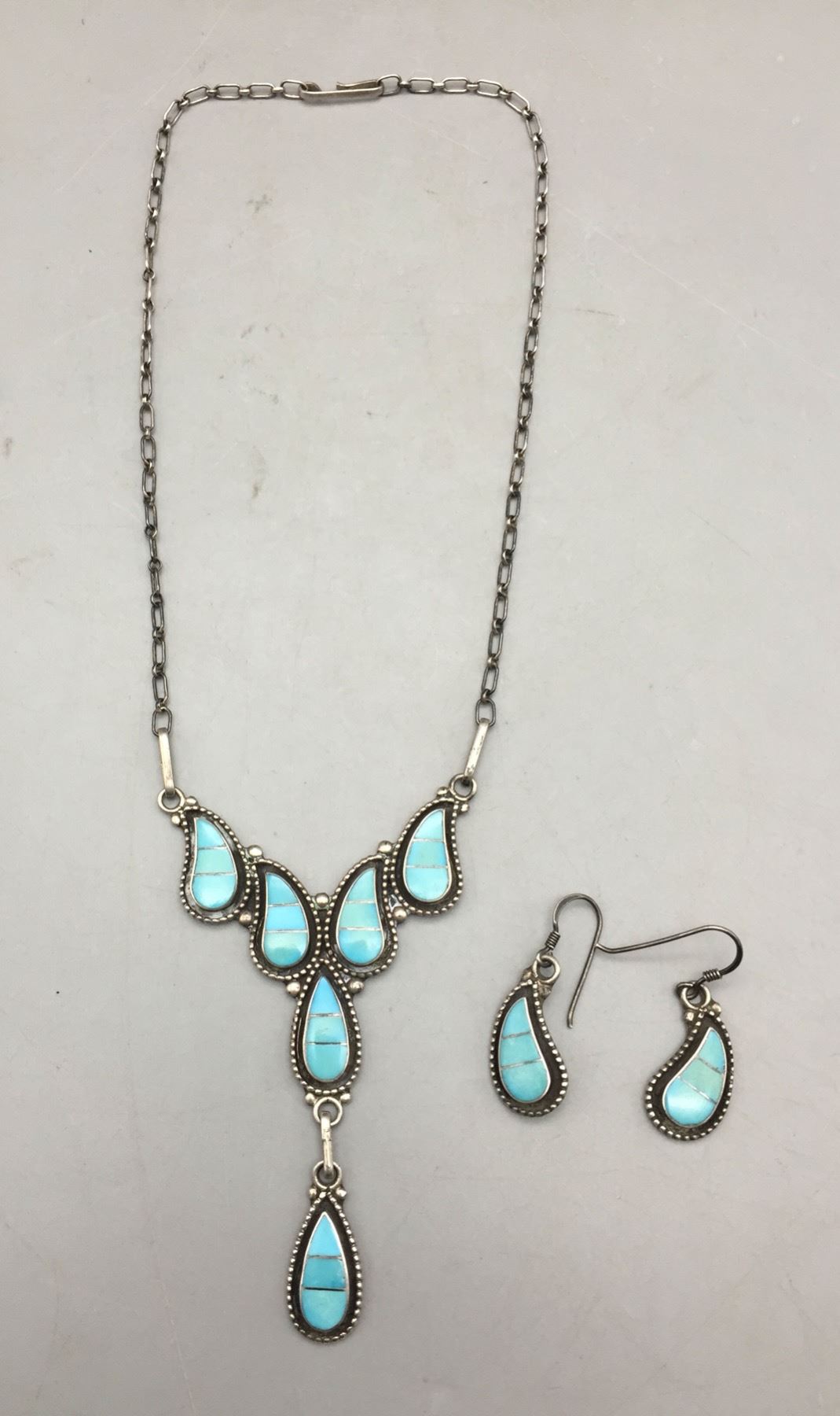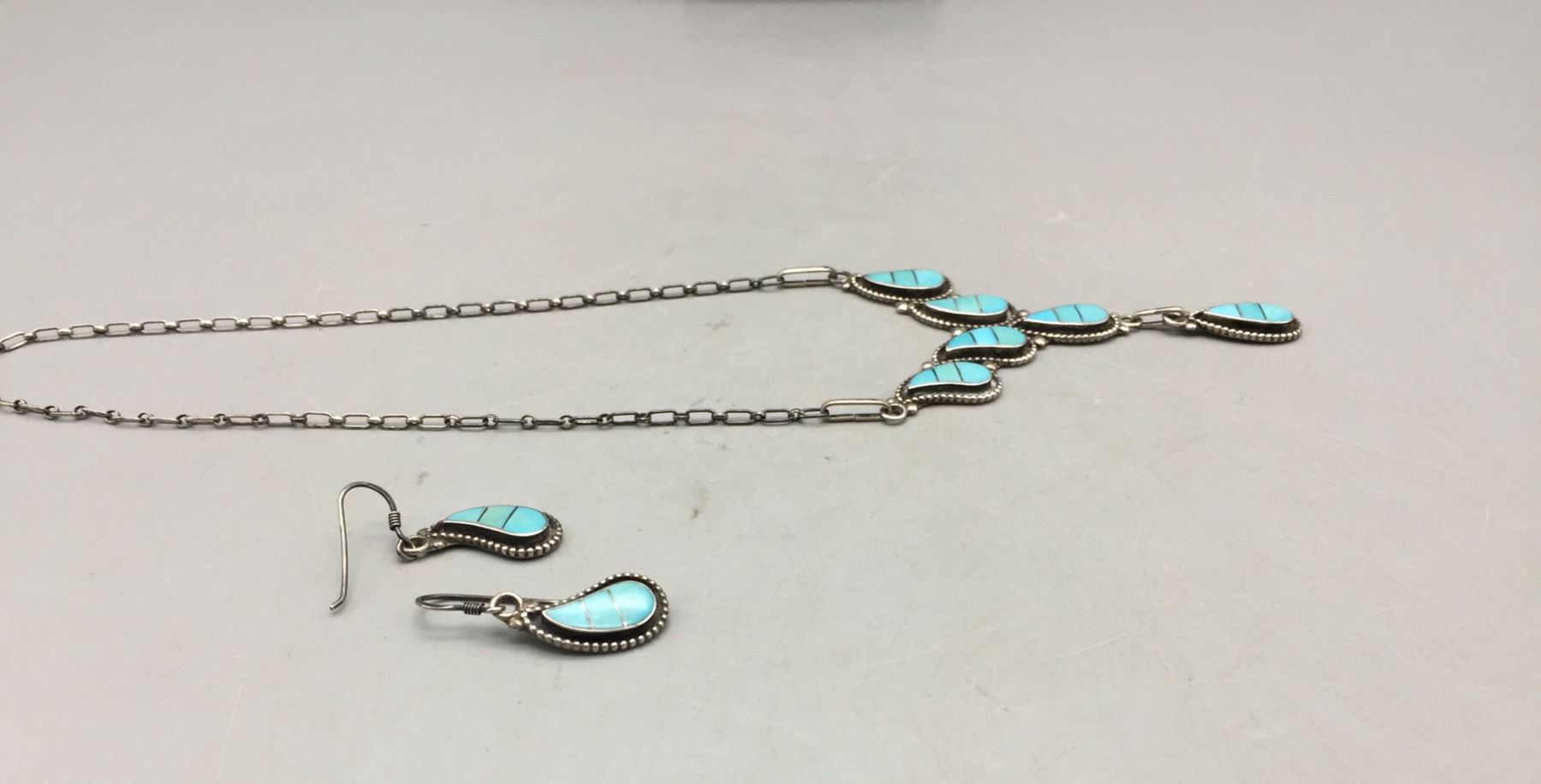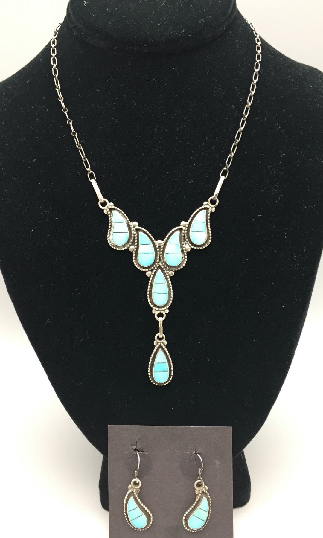 Description: Presented for sale in this lot is a beautiful turquoise channel inlay necklace set. This stunning necklace has a very elegant design and matching earrings. It is sterling silver where applicable. Maker: Hallmarked with what appears to be the initials WS and DU (or DW) and Zuni in script. Approx. Age: Vintage to modern. Size: Fits a 15 inch neck. Dangle measures 1-3/8 inches long x 1/2 inches wide. Earrings measure 1 inch long x 1/2 inches wide. Combined weight is 22 grams. Condition: Good for their age, normal wear expected. Please look closely at the pictures - they are an important part of our description. Shipping: There will be a $5 handling, packaging fee for shipping this lot. The actual cost of postage will be added on top of that.
