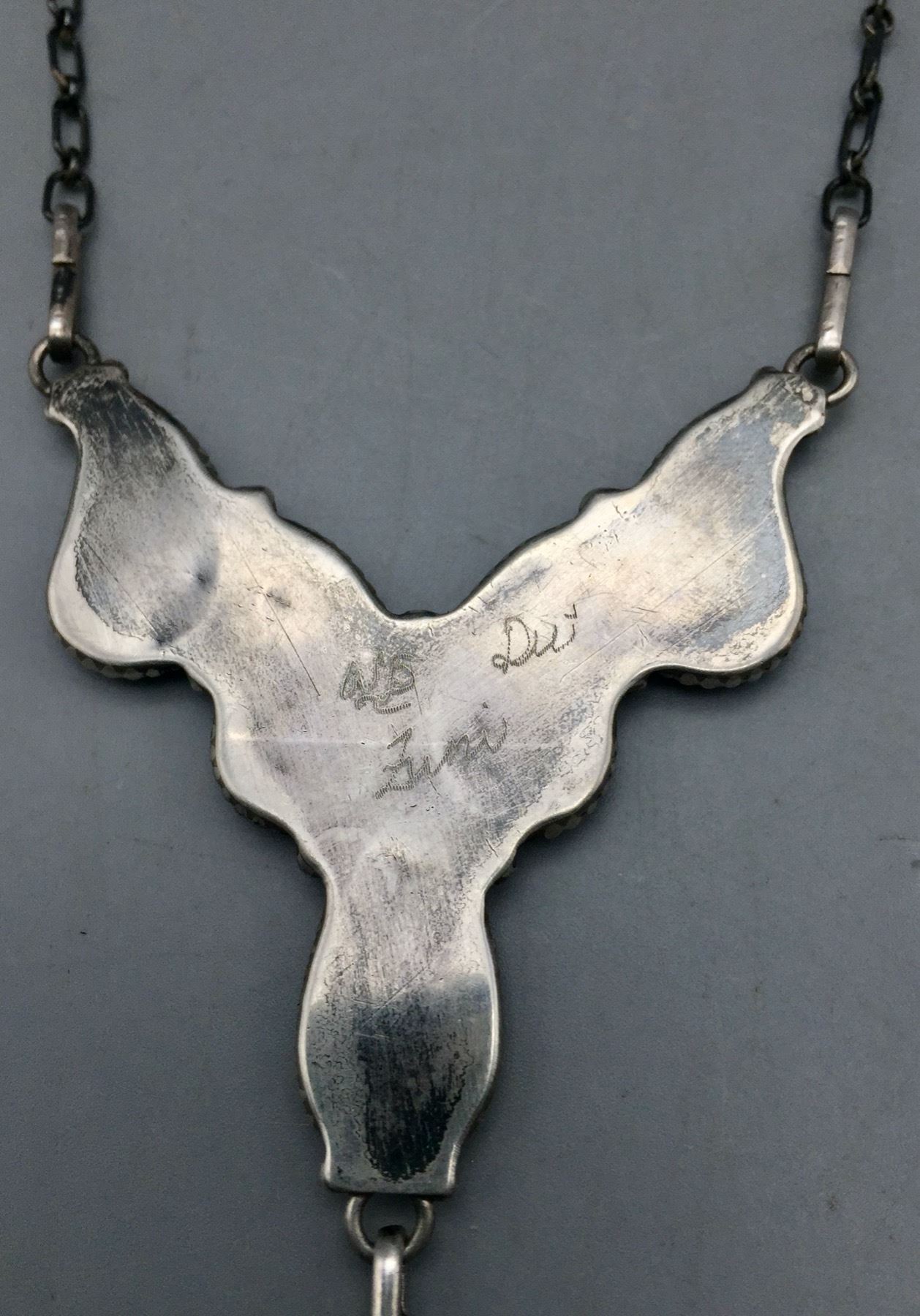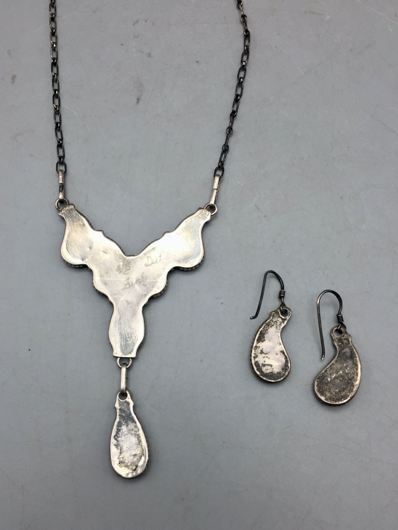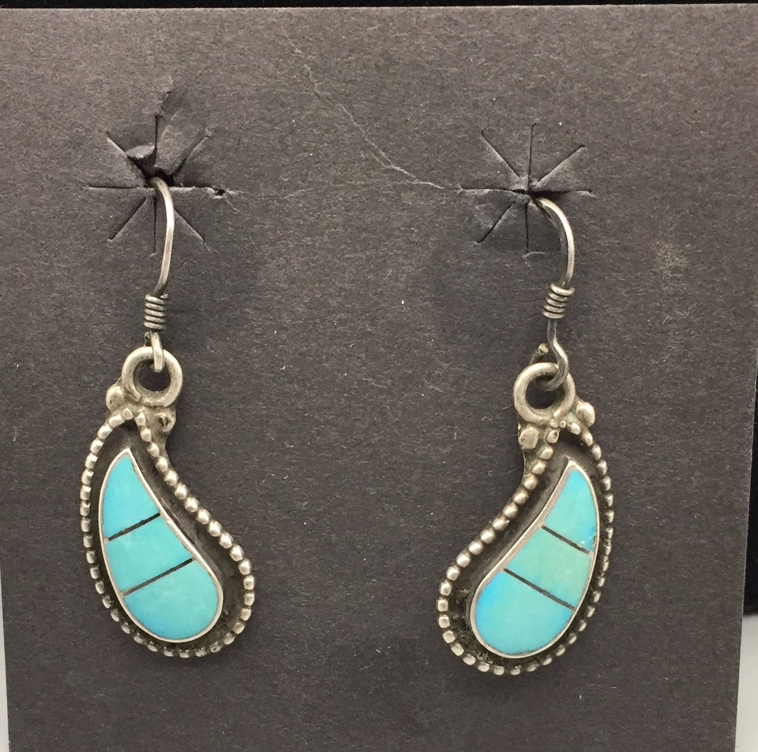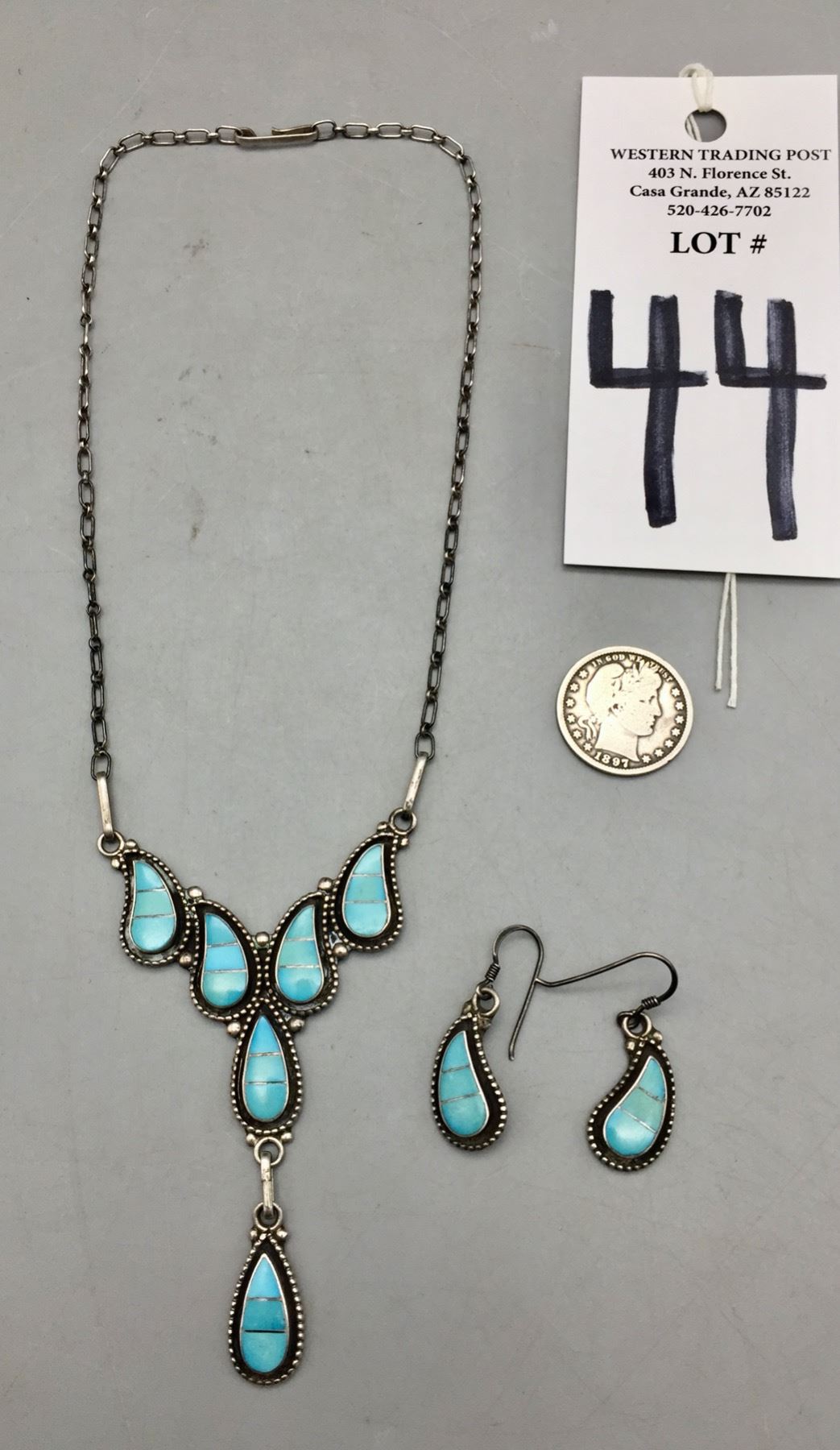 Description: Presented for sale in this lot is a beautiful turquoise channel inlay necklace set. This stunning necklace has a very elegant design and matching earrings. It is sterling silver where applicable. Maker: Hallmarked with what appears to be the initials WS and DU (or DW) and Zuni in script. Approx. Age: Vintage to modern. Size: Fits a 15 inch neck. Dangle measures 1-3/8 inches long x 1/2 inches wide. Earrings measure 1 inch long x 1/2 inches wide. Combined weight is 22 grams. Condition: Good for their age, normal wear expected. Please look closely at the pictures - they are an important part of our description. Shipping: There will be a $5 handling, packaging fee for shipping this lot. The actual cost of postage will be added on top of that.