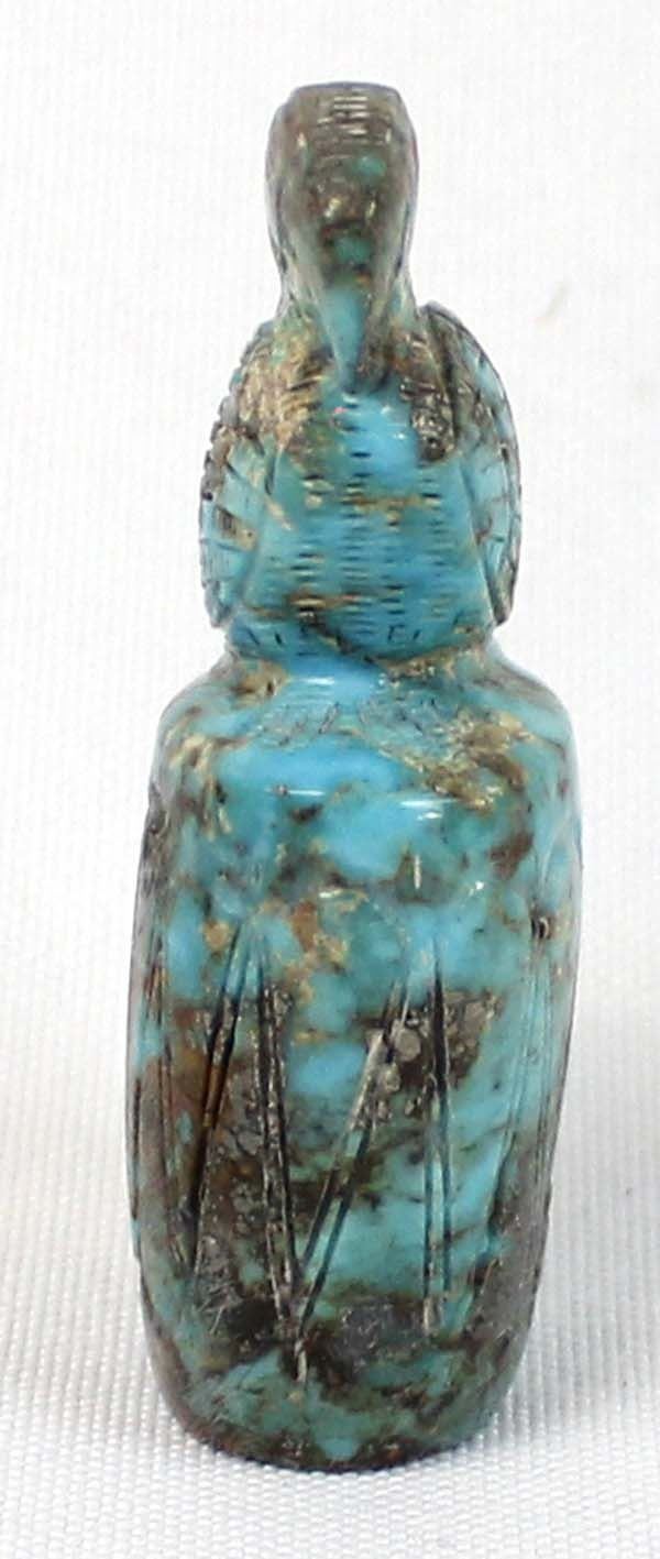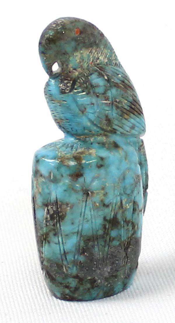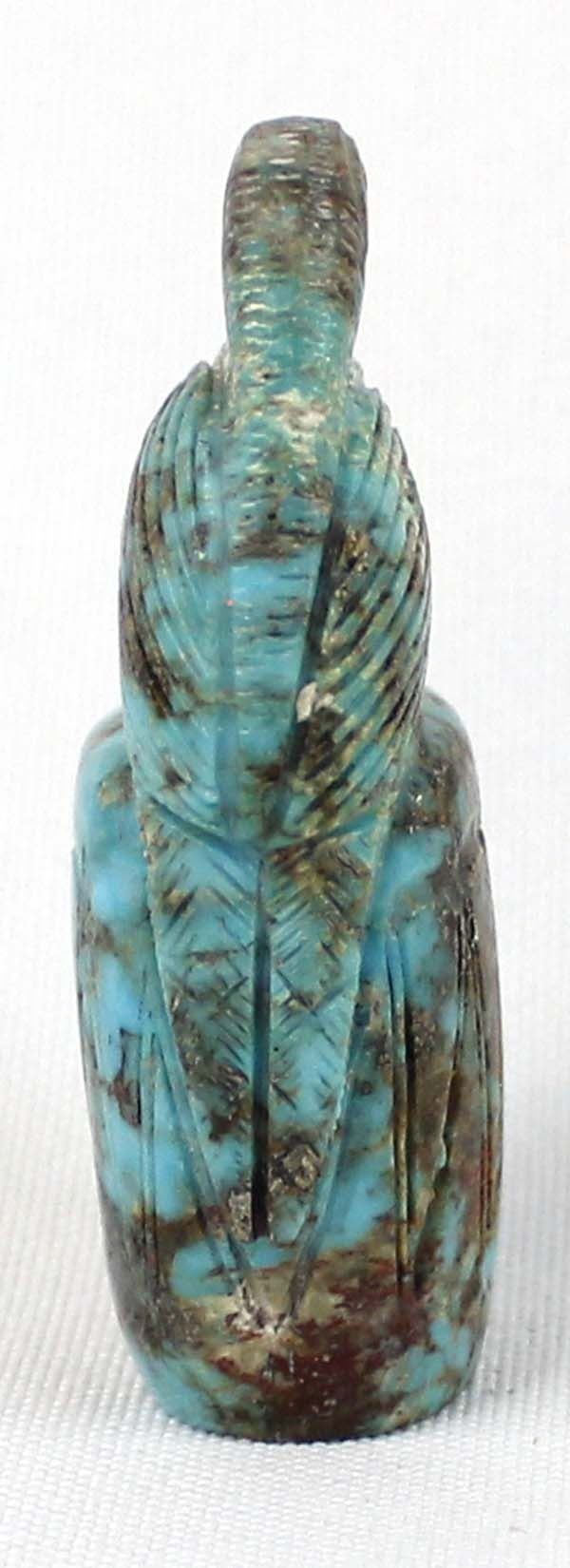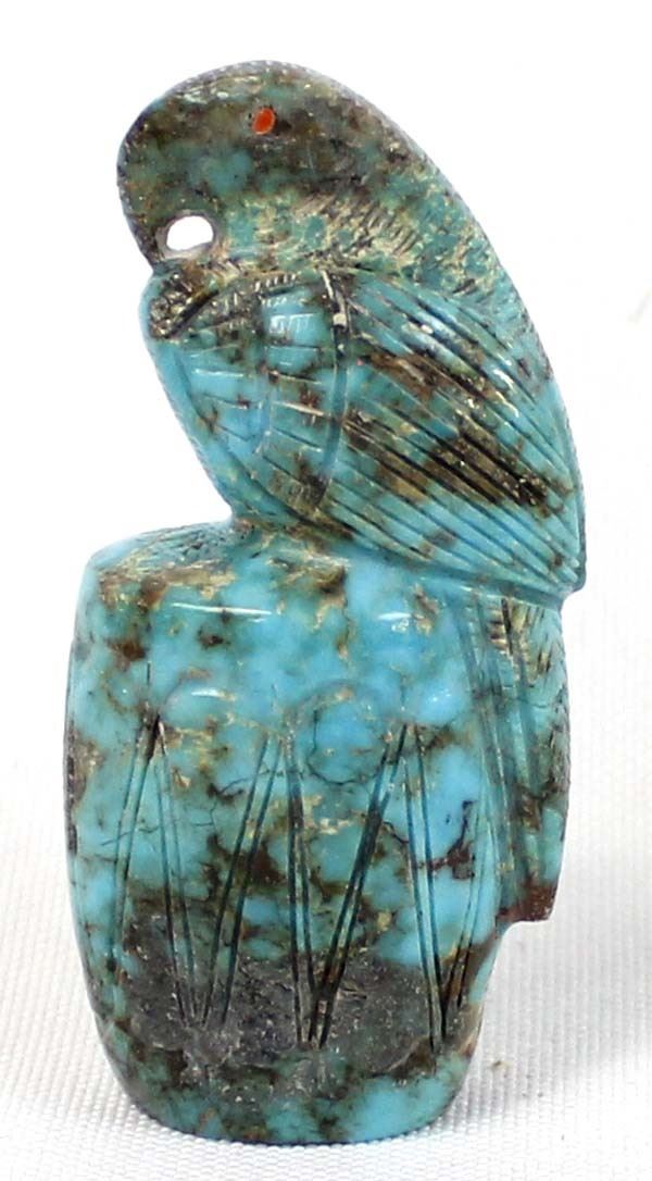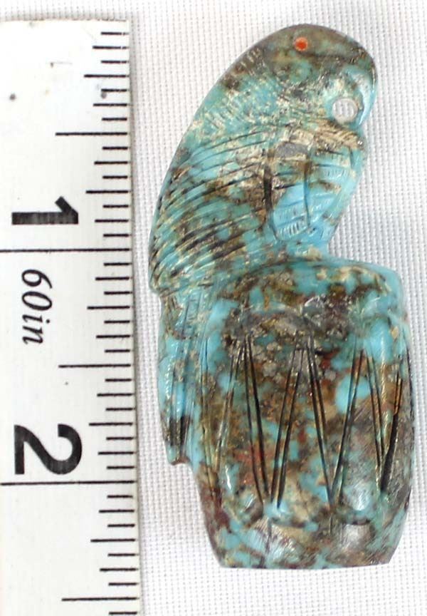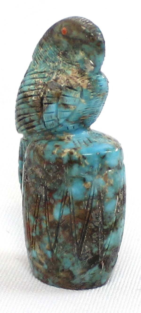 Native American Zuni Turquoise Eagle Fetish by Vince Chavez, measures 2'' x 1'' x .5'' and has artist's initials on the bottom, coral eyes