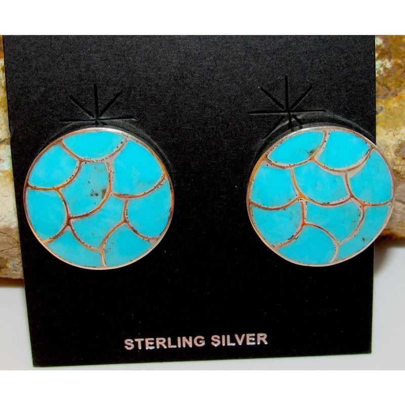 Fab pair of Zuni sterling silver and Sleeping Beauty mine turquoise fish scale inlay post earrings by the collectible Zuni artist K. Seoutewa. Fab pieces. Measure about 1". FREE SHIPPING ON ALL JEWELRY ORDERS WITHIN THE US!