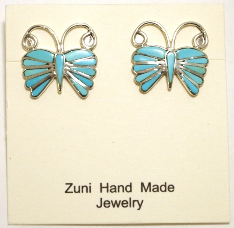 Zuni Turquoise Inlay Sterling Silver Butterfly Post Earrings - Emma Edaakie