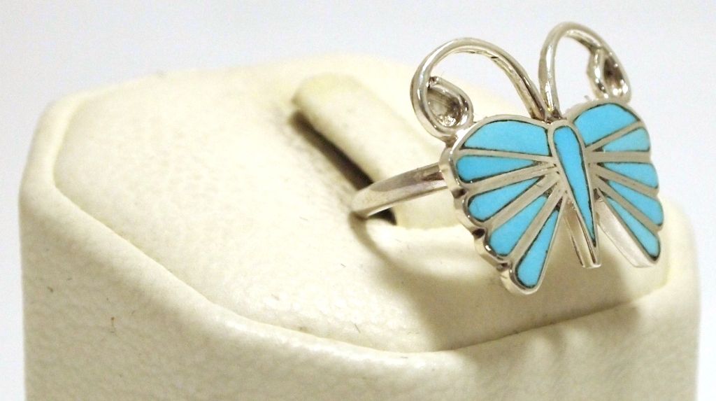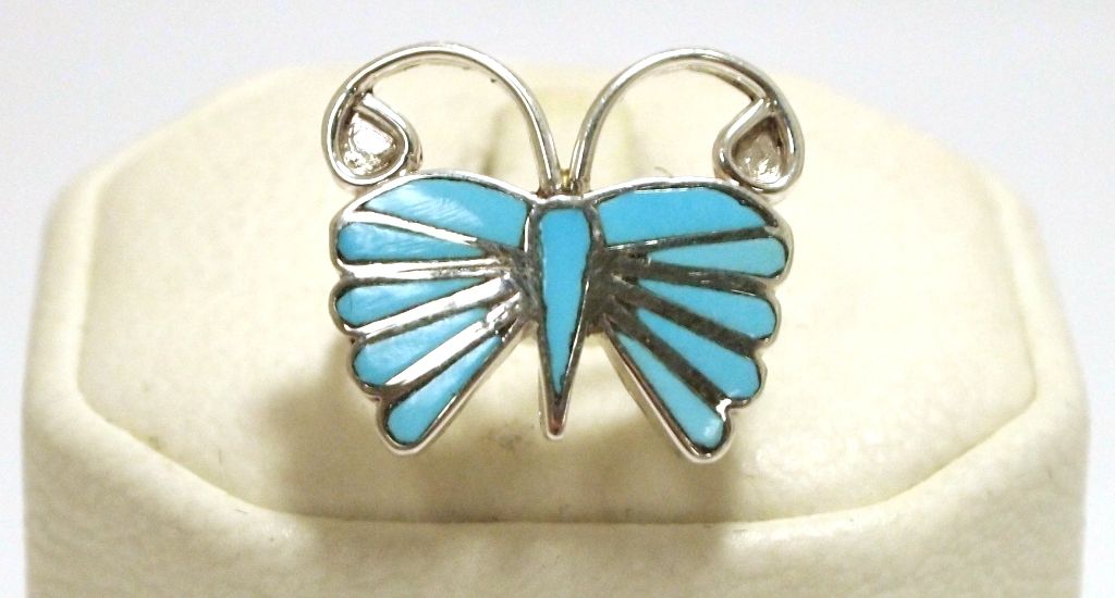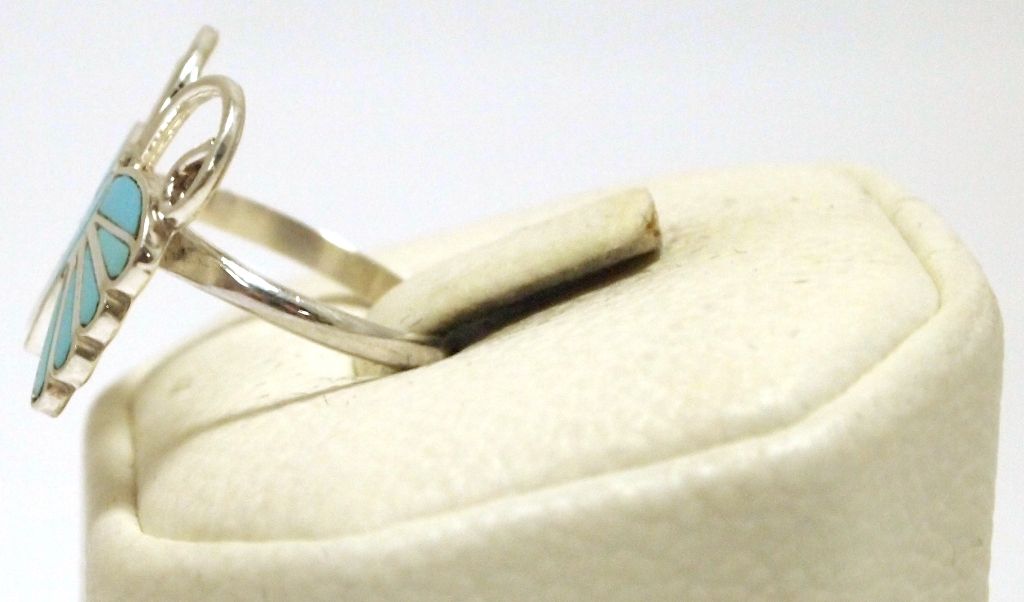 Zuni Turquoise Inlay Sterling Silver Butterfly Women's Ring - Earline Edaakie