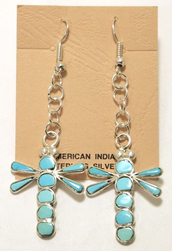 Zuni Turquoise Inlay Sterling Silver Dragonfly French Hook Earrings - Emma Edaakie