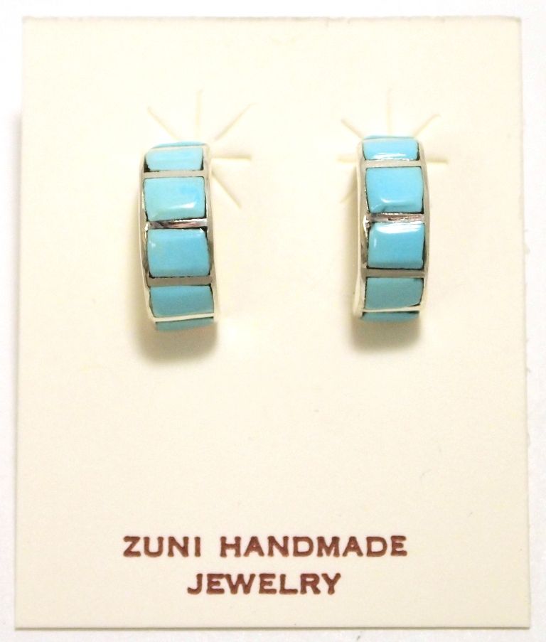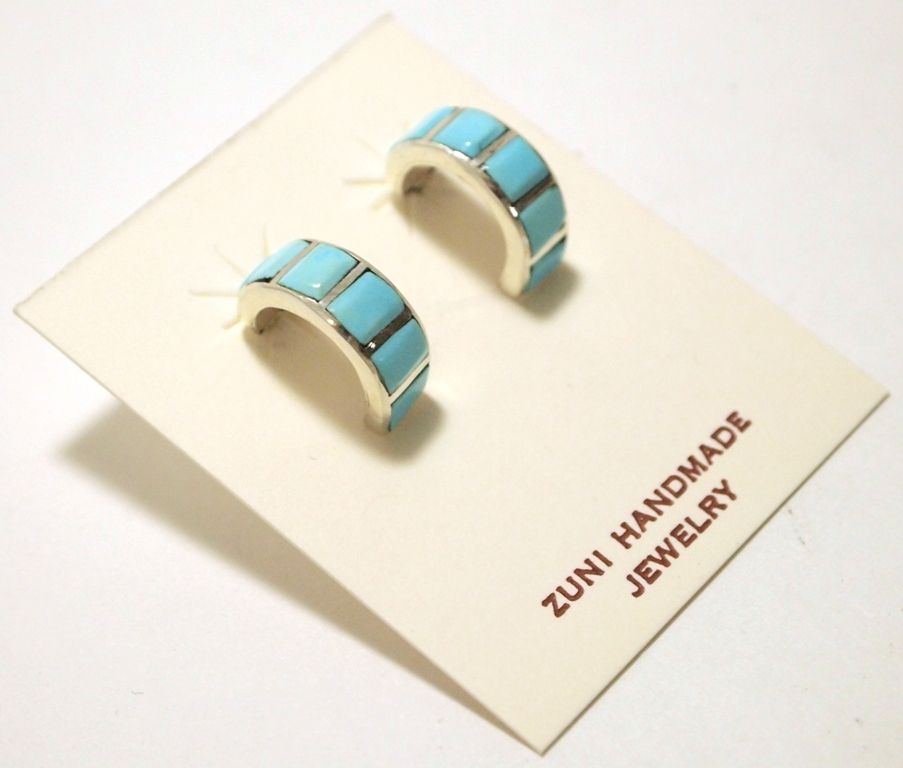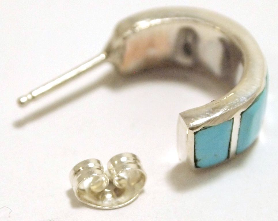 Zuni Turquoise Inlay Sterling Silver Half-Ring Post Earrings - Glennetta Luna