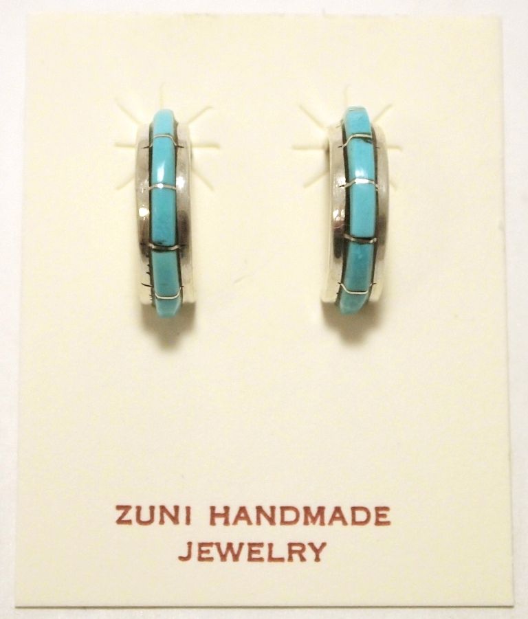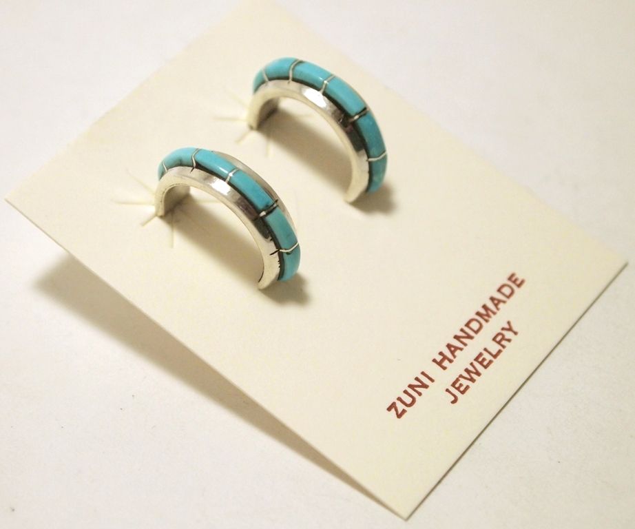 Zuni Turquoise Inlay Sterling Silver Half-Ring Post Earrings - Keith Nastacio