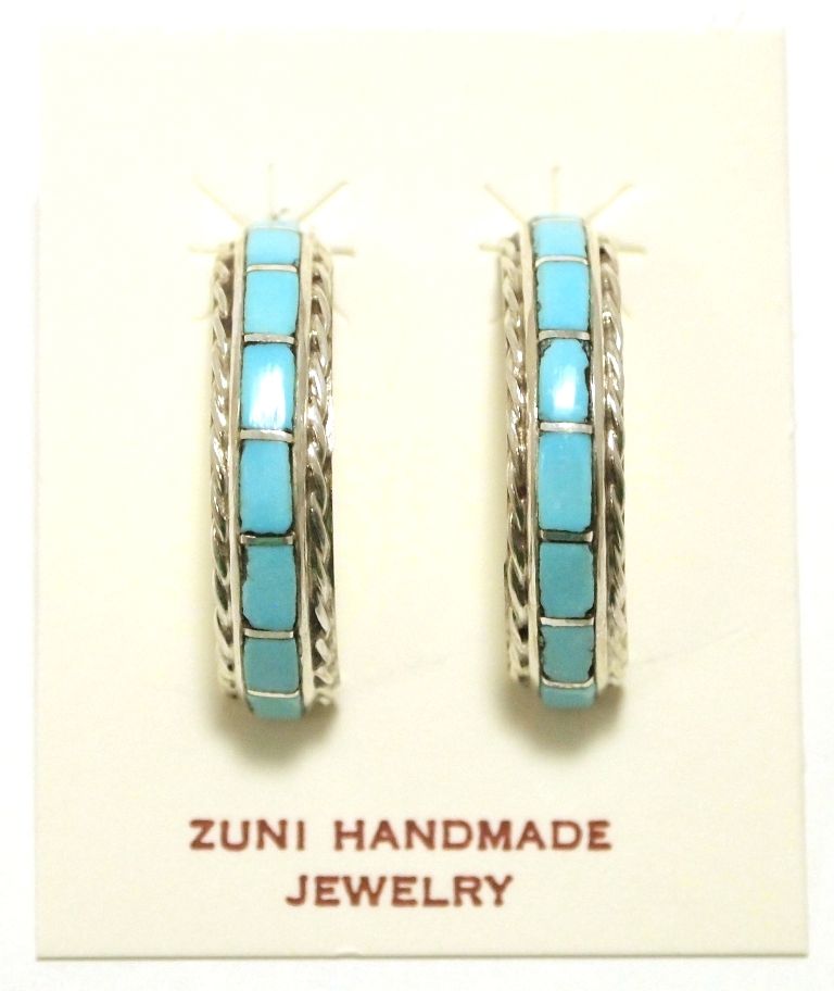 Zuni Turquoise Inlay Sterling Silver Half-Ring Post Earrings - Malcolm Chavez