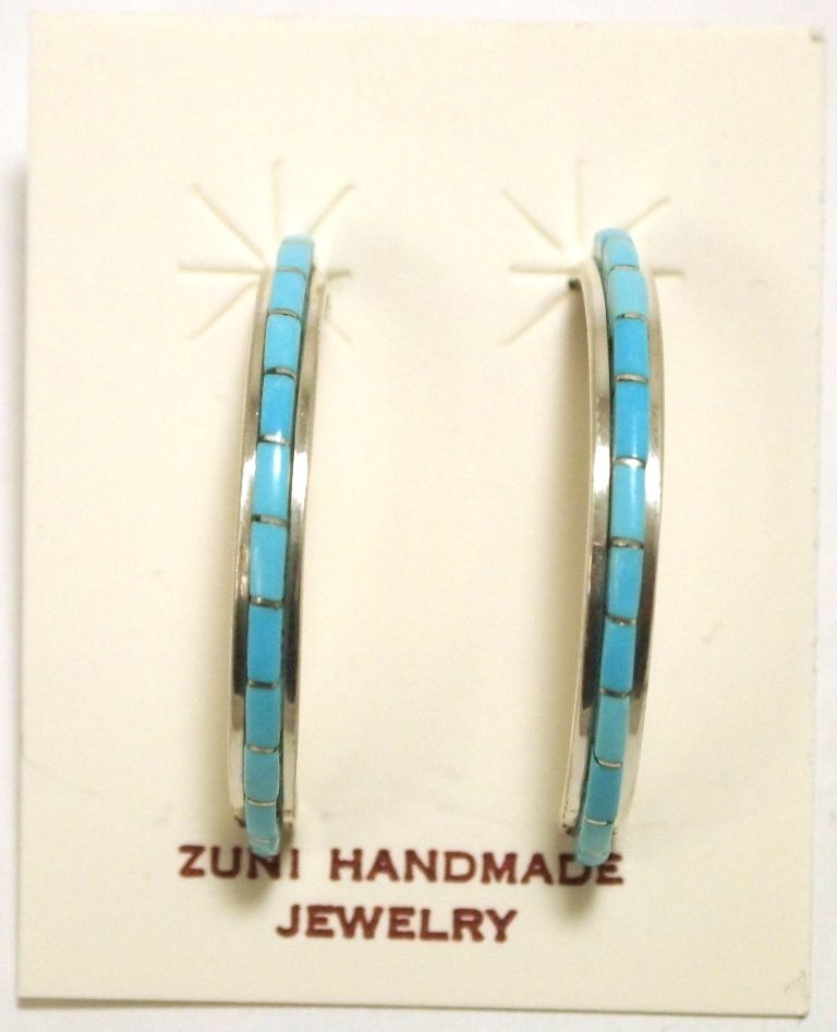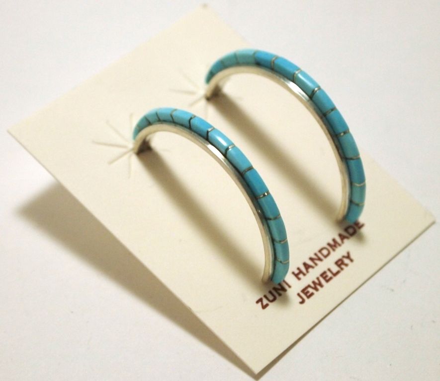 Zuni Turquoise Inlay Sterling Silver Half-Ring Post Earrings - Susan Kalestewa