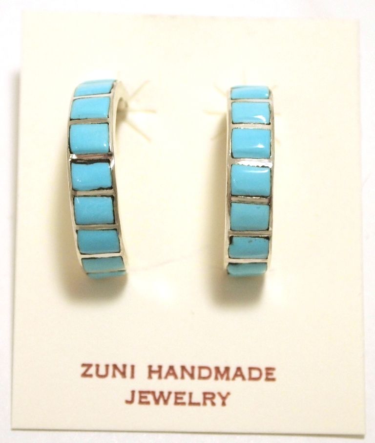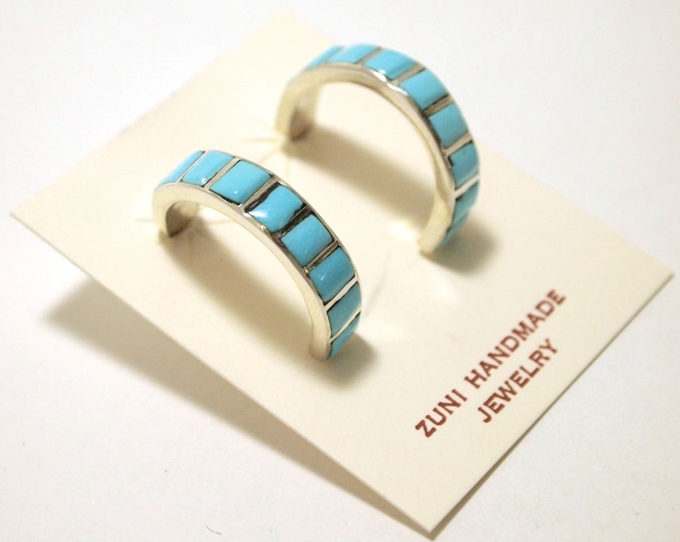 Zuni Turquoise Inlay Sterling Silver Large Half-Ring Post Earrings - Glennetta Luna