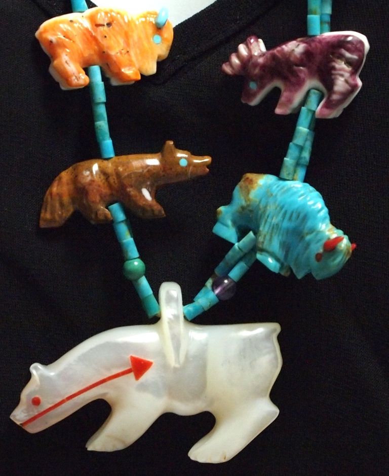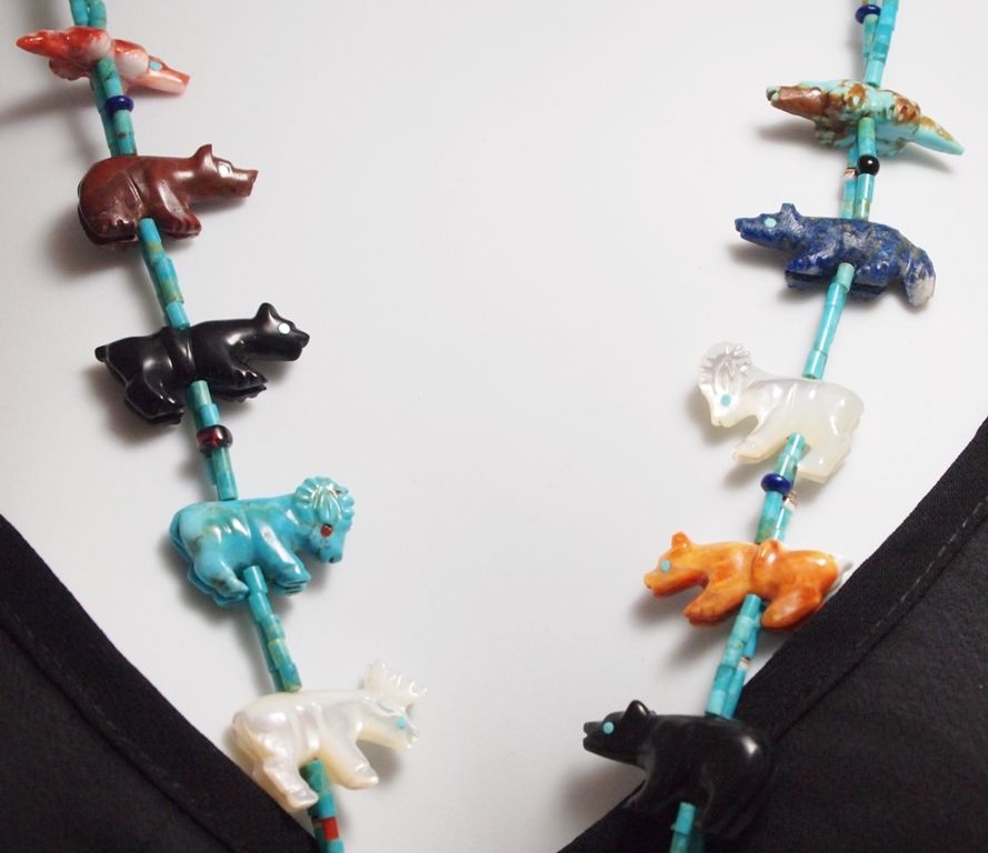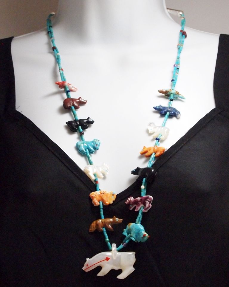 Measures 28" around by 1/16" wide each strand. Bottom Bear fetish is Mother of Pearl and measures 1-1/8" tall by 1-7/8" wide. Fourteen other fetishes are made of Mother of Pearl, Turquoise, Jasper, Spiny Oyster, Lapis Lazuli, and Black Jet and measure approximately 1/4" to 1/2" tall by 1" wide. Animals present: Bear, Alligator, Ram, Moose, Buffalo, Coyote.
