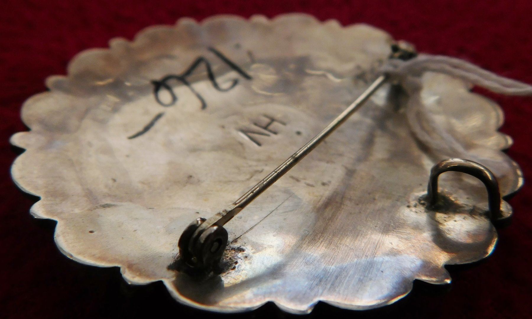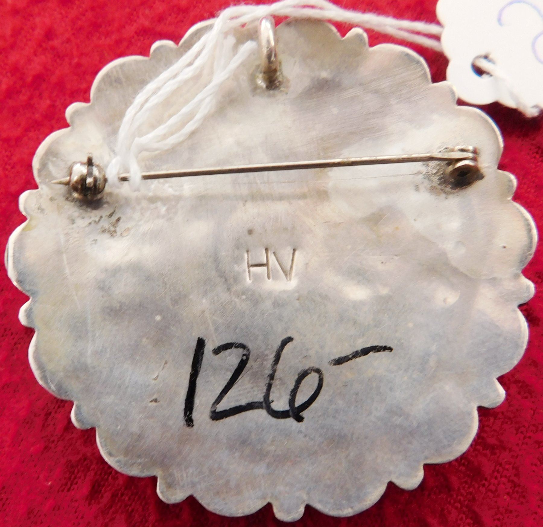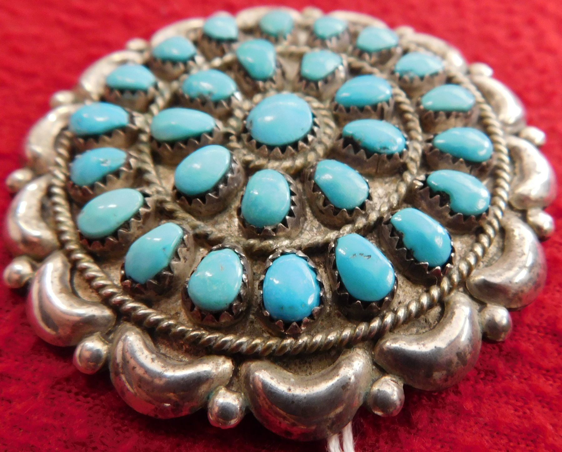 Zuni Turquoise Pin or Pendant, circa 1950s. Made of nickel silver and turquoise, the item measures 2" x 2". Signed HV. There are 28 turquoise stones on this brooch or pendant. Condition: Worn, see images. Shipping: $12.50 w/insurance and signature.