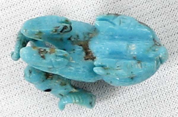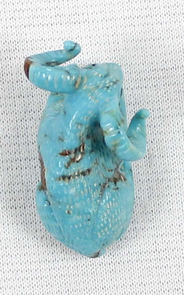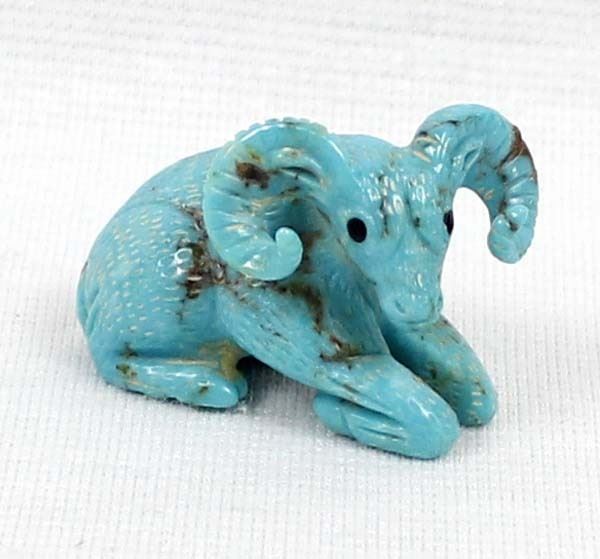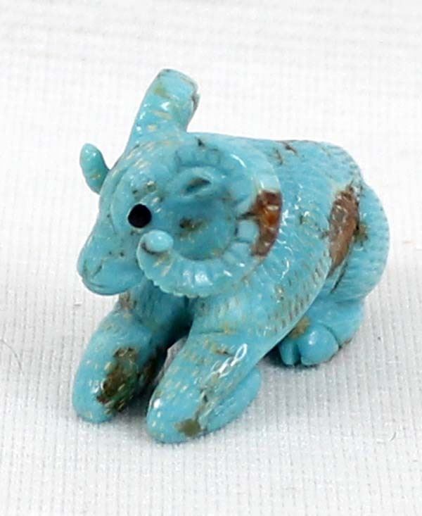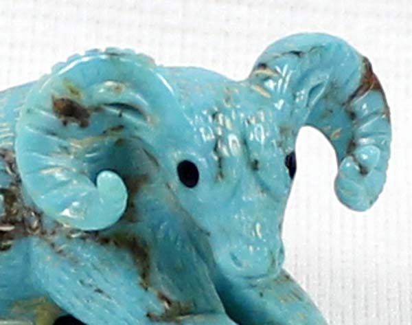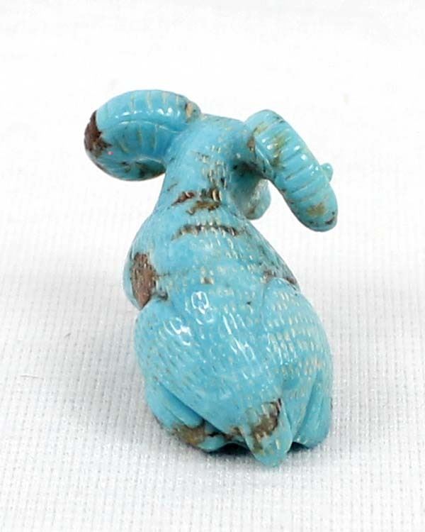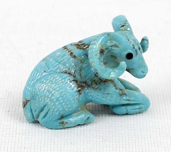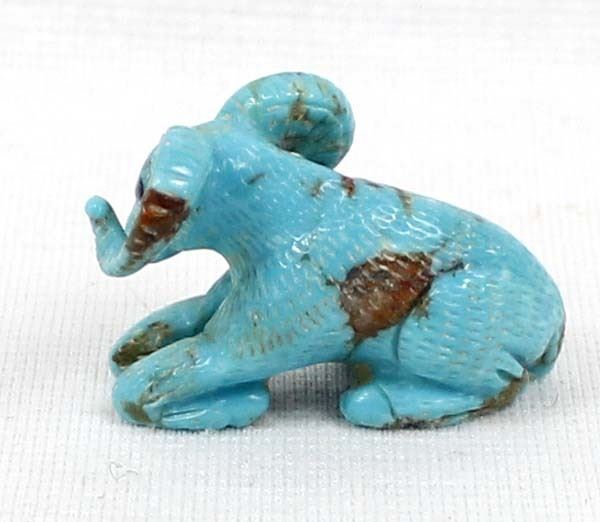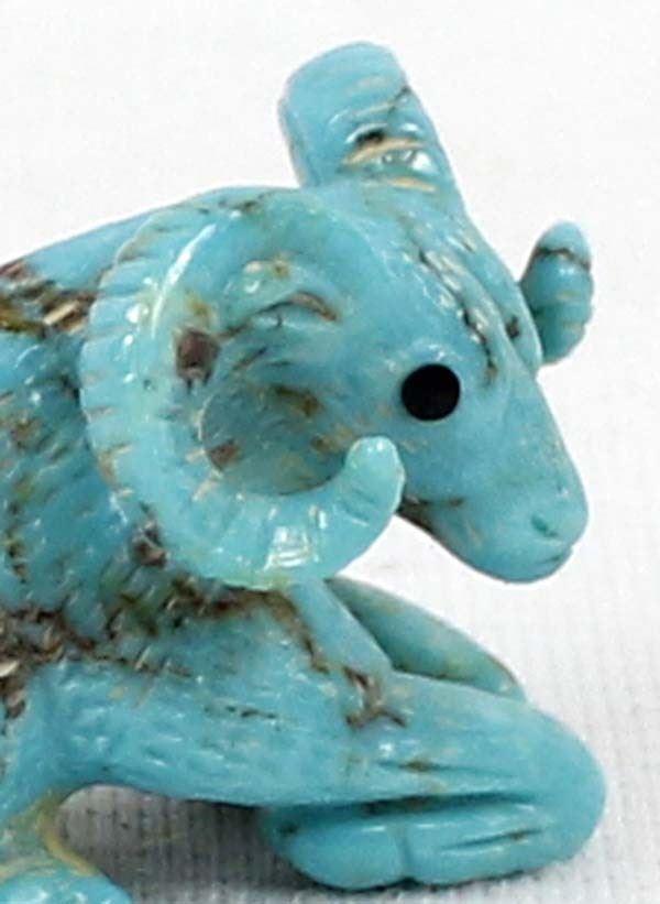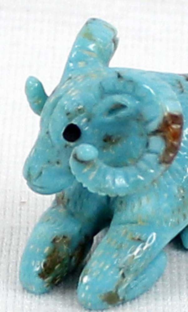 Native American Zuni Turquoise Ram Fetish by Fabian Cheama, measures 1.25''L x 7/8''H x 7/8'' and is signed on the bottom, jet eyes