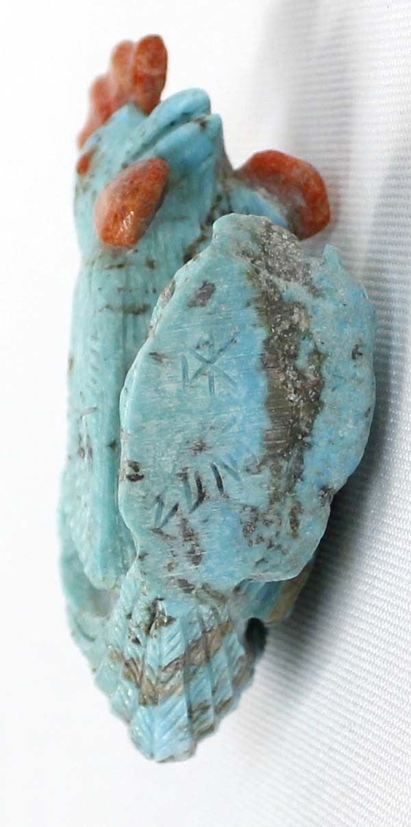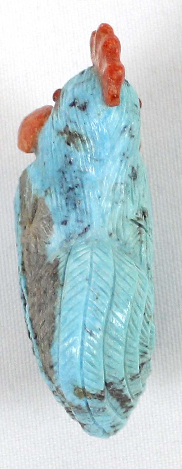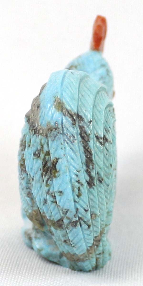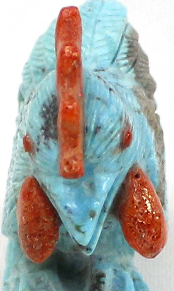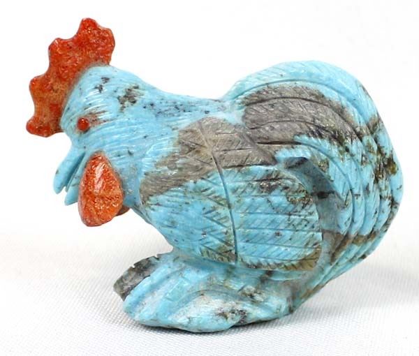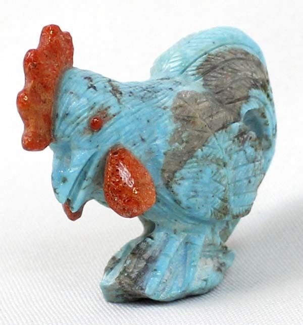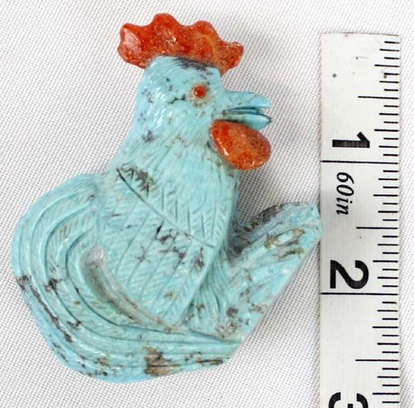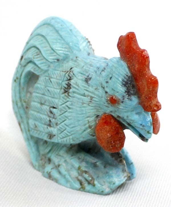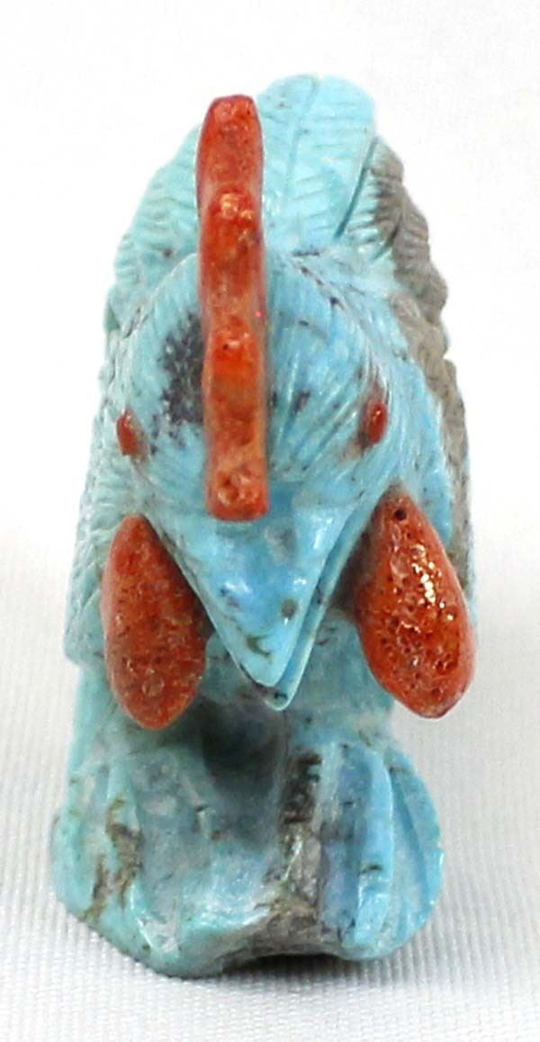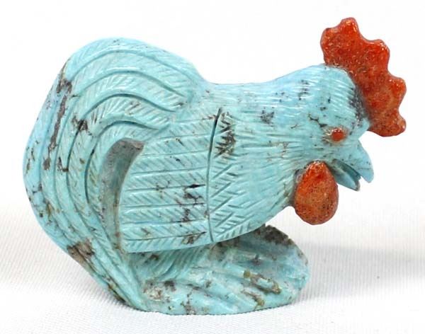 Native American Zuni Turquoise Rooster Fetish by Derrick Kaamasee, apple coral comb and eyes, measures 2.5'' x 2'' x .75'' and has artist's initials on the bottom
