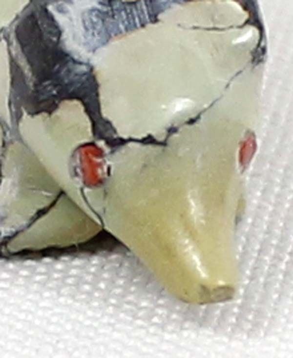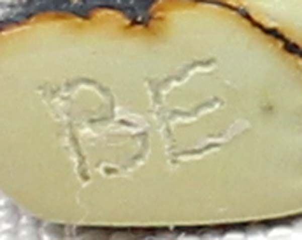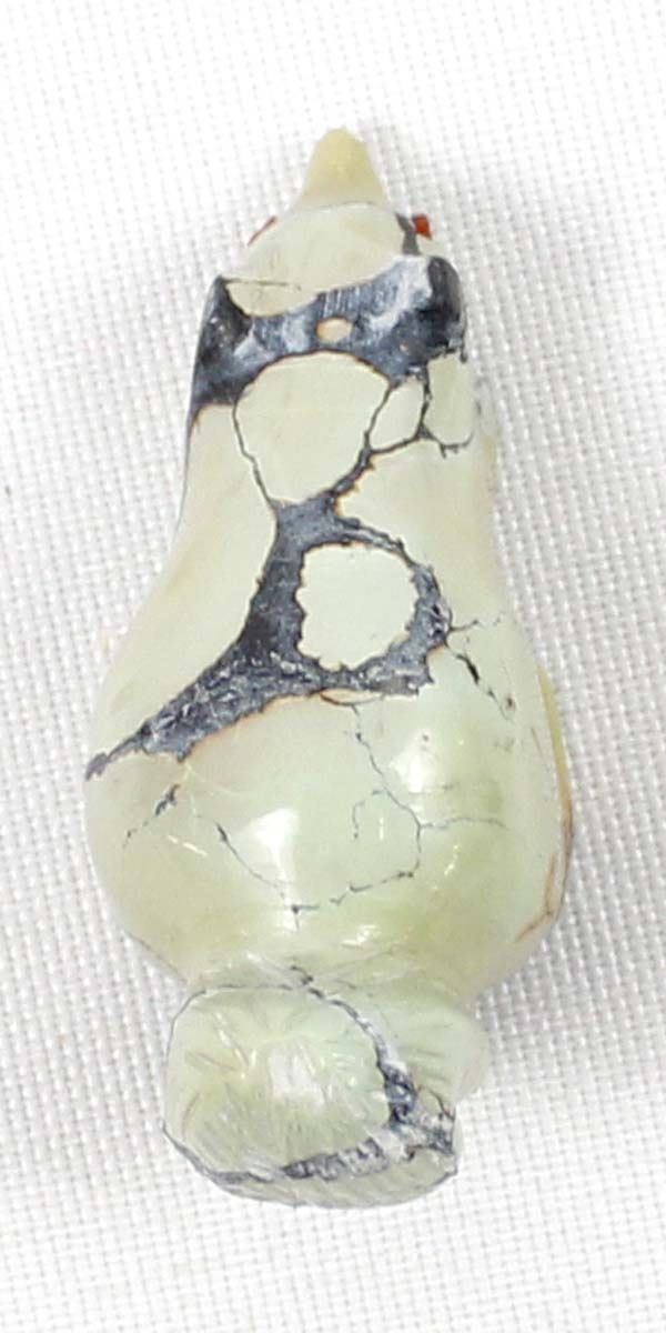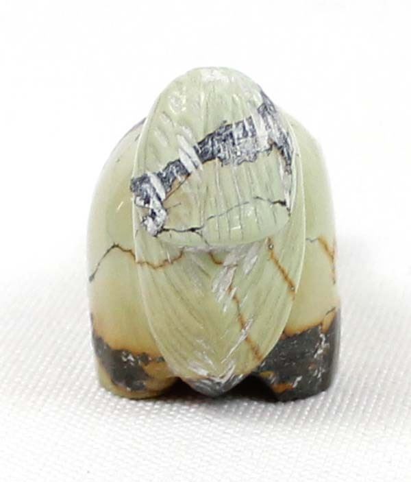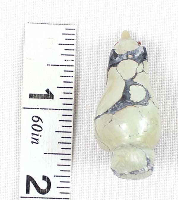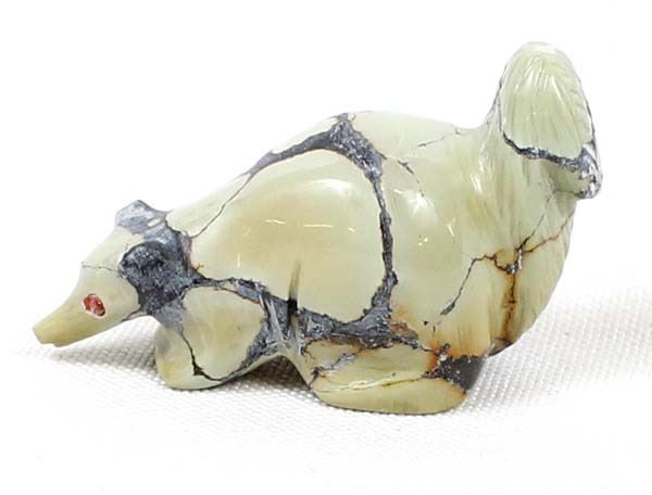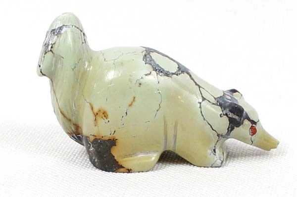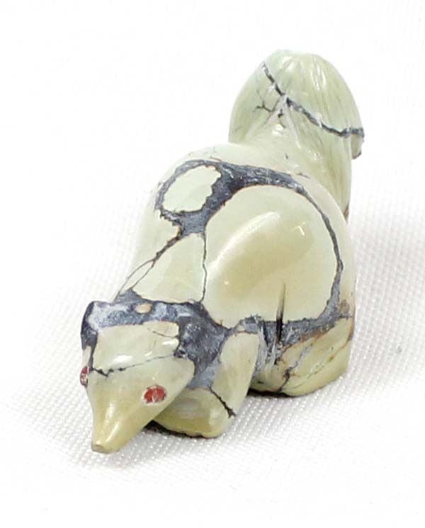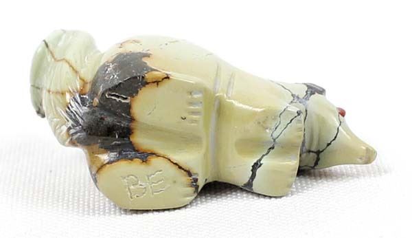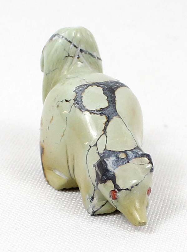 Native American Zuni Turquoise Skunk Fetish by Bremette Epaloose, measures 1'' x 2'' and has artist's initials on the bottom, coral eyes