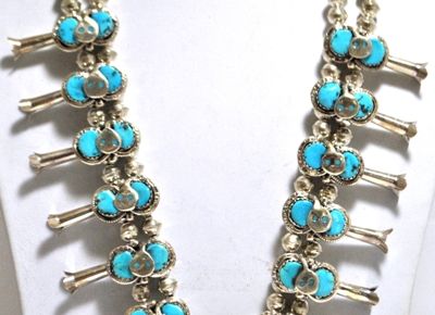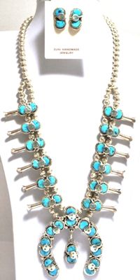 Zuni Turquoise Snake Squash Blossom Sterling Silver Necklace & Earrings Set - Effie Calavaza