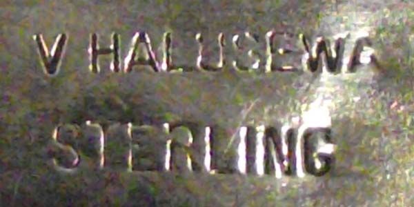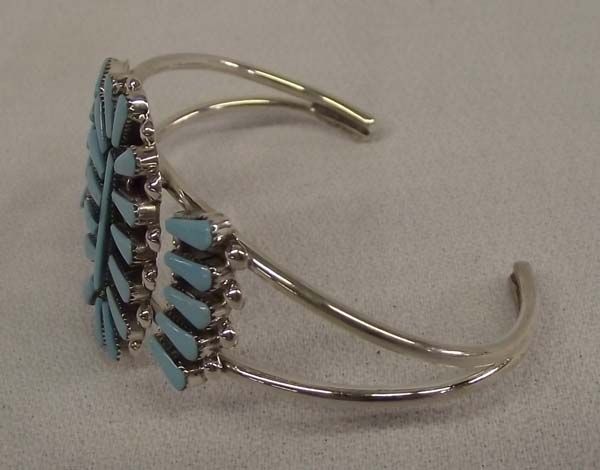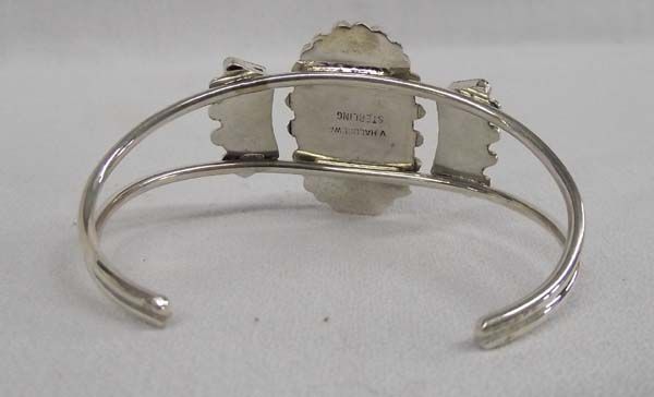 Native American Zuni Turquoise Sterling Bracelet - Halusewa. Lovely, delicate bracelet with two rings of silver and a center cluster type setting of clear blue turquoise. It measures 5-7/8'' inside including the measurement. The center cluster measures 1.25''Lx3/4''W. It is hallmarked on the inside, ''VHalusewa STERLING.''