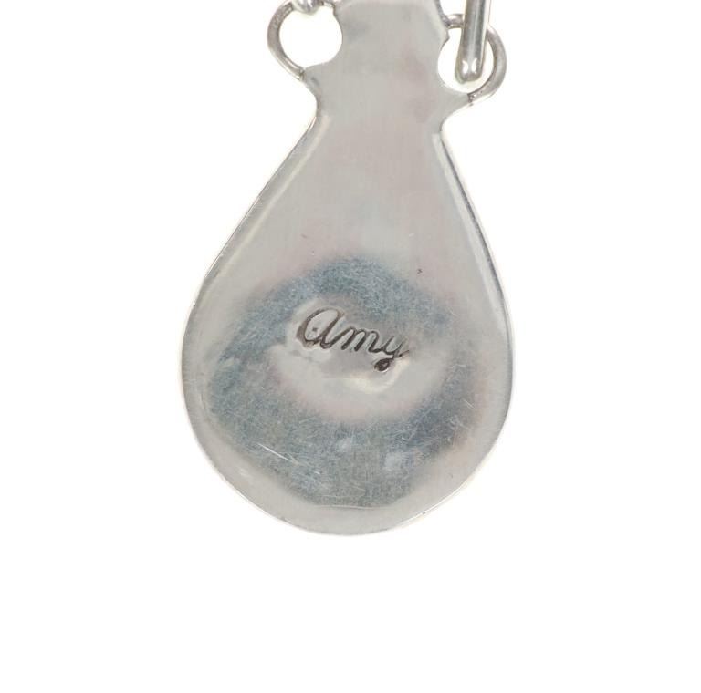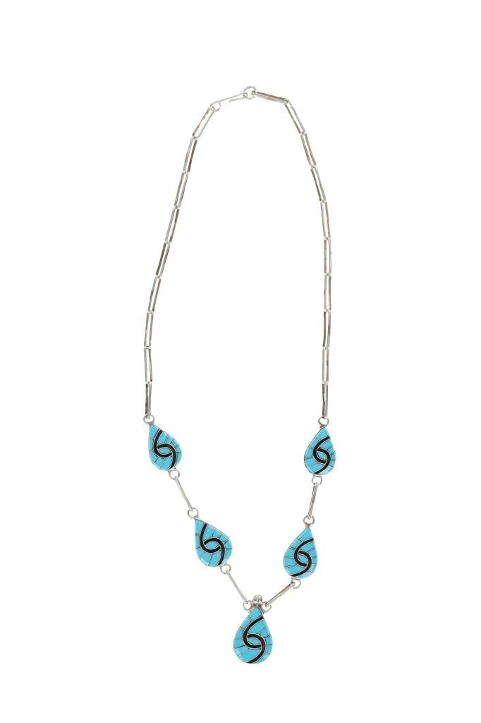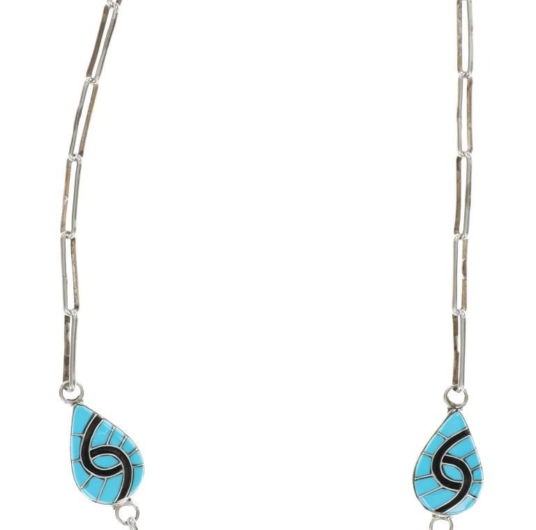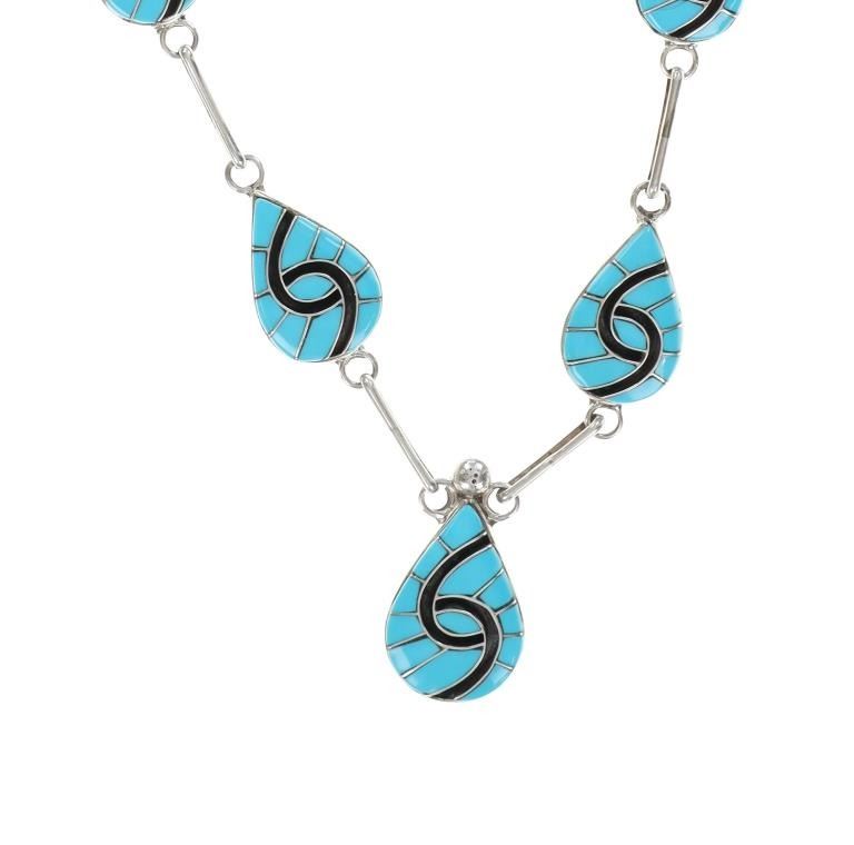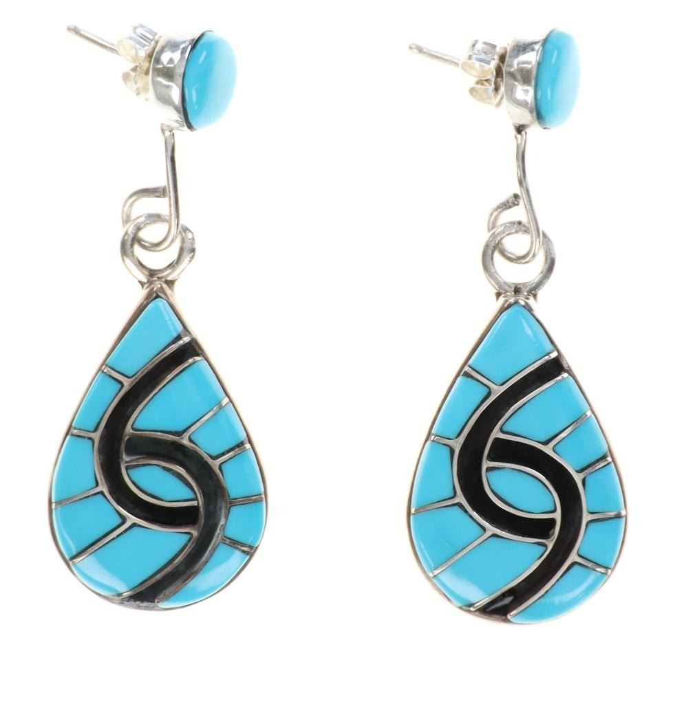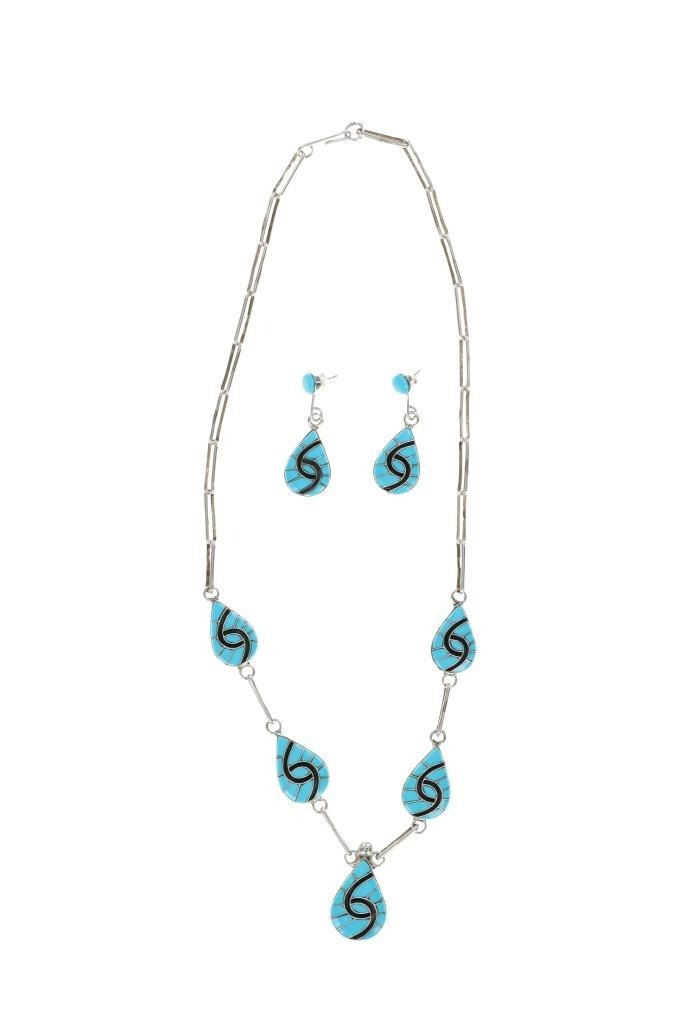 For your consideration is this signed Zuni sterling & sleeping beauty necklace and earrings set. The necklace and earrings showcase a gorgeous Sleeping Beauty turquoise and black onyx inlay in a hummingbird design set on a sterling base. The back of the earrings and necklace is signed, "Amy". The earrings show the same inlaid design and feature a circular cabochon of Sleeping Beauty turquoise at the top of each. The necklace and earrings show like new condition with no wear or damage present. The necklace from clasp to clasp measures 24 1/8", while the inlaid pendants measure 1" L x 3/4" W. The earrings measure 1 7/8" L x 5/8" W. The necklace weighs 43 grams, while the collective weight of the earrings is 11.6 grams.