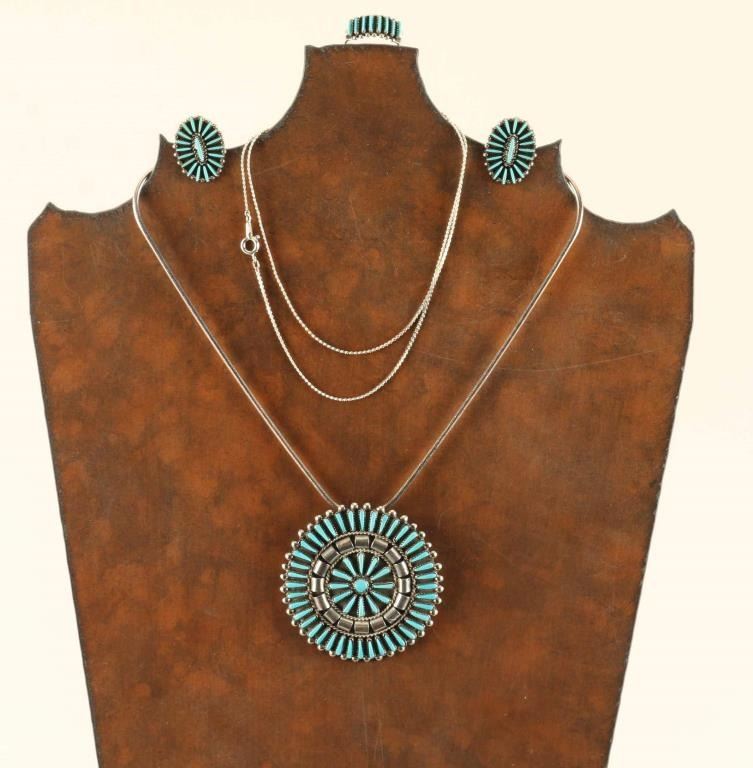 Zuni turquoise needlepoint pendant/pin, clip earrings and ring all set in sterling silver. Ring is a size 6. Pendant comes with two different style silver chains-16" and 19 1/2".