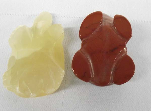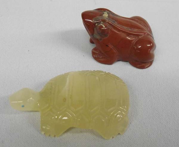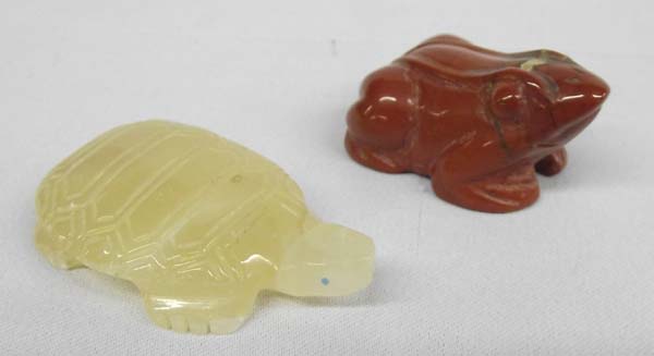Native American crafted Zuni turtle fetish with turquiose inlayed eyes, measures approx 2.25 x 1.25. The Frog is crafted from red stone, possible Chinese made, unsure. Measures approx. 2 x 1.25 inches. Buyers Pay Actual Shipping and Handling Charges(see terms and conditions for more information).