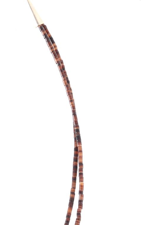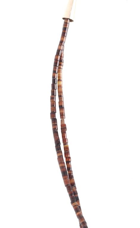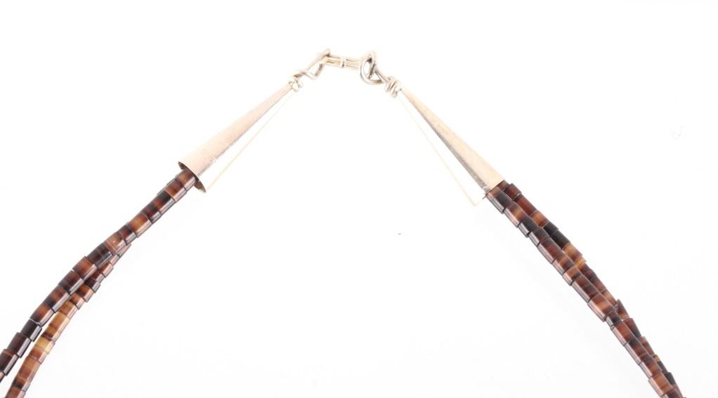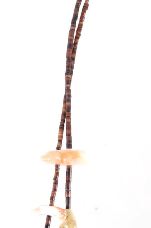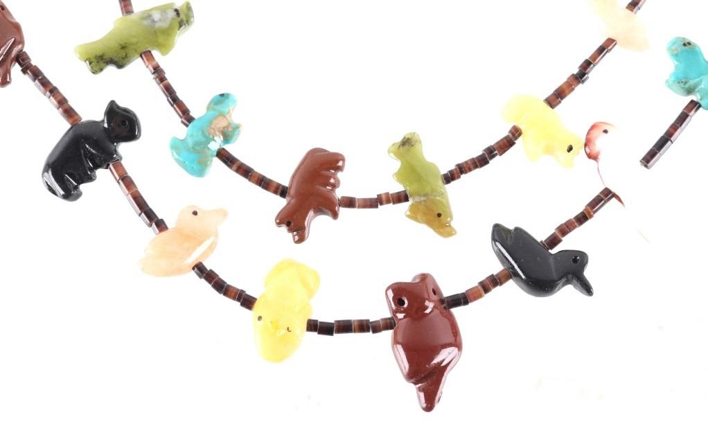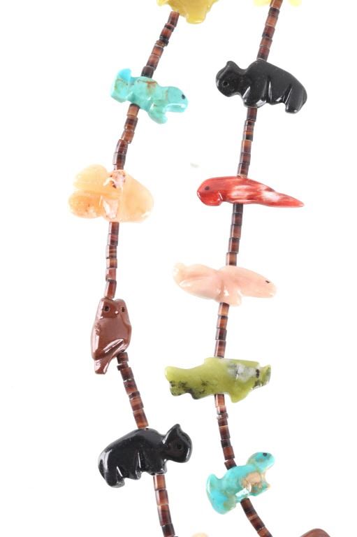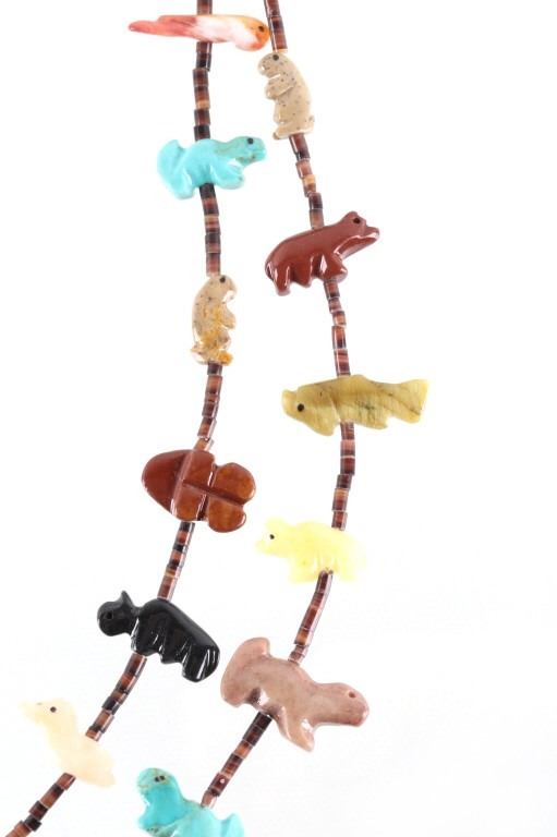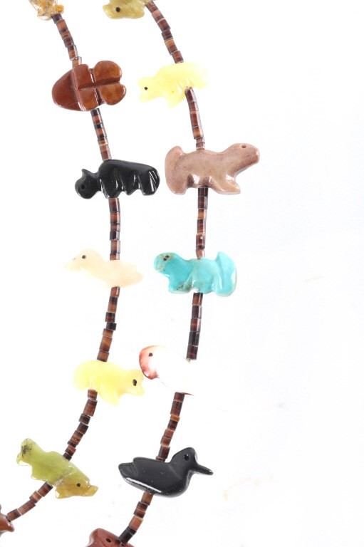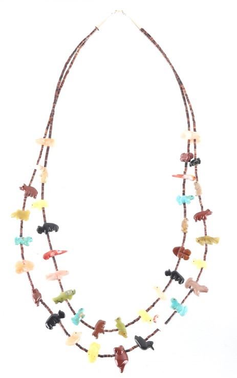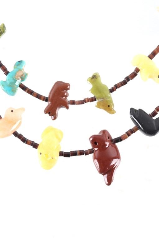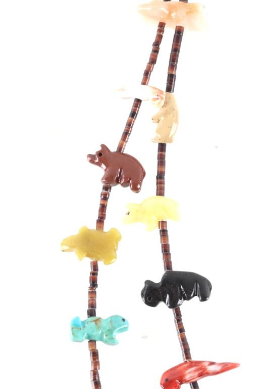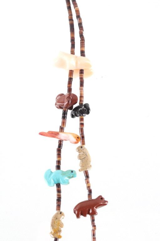 For your consideration is this Zuni, multi-stone, double strand fetish necklace done by Zuni artist Neil Thomas. Zuni fetish necklace have been a staple in Native American Jewelry for centuries. The fetish animals are based on Zuni Tradition. In the tradition, each animal is believe to have powers that aid the owner. The Eagle is most sacred, as it symbolizes the power Great Spirit. The Bear symbolizes strength and power within. These animals are all well-carved with high detail and each have a high polish. The stones used in this necklace are Sleeping Beauty turquoise, red jasper, black onyx, and agate. The necklace is strung with small cylindrical cuts of cats-eye stone. The necklace is in good condition with no signs of damage or wear present. The largest fetish measures 7/8" L x 1/2" W, while the smallest measure 1/2" L x 1/4" W. The necklace from clasp to clasp measures 28 3/4" L.