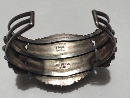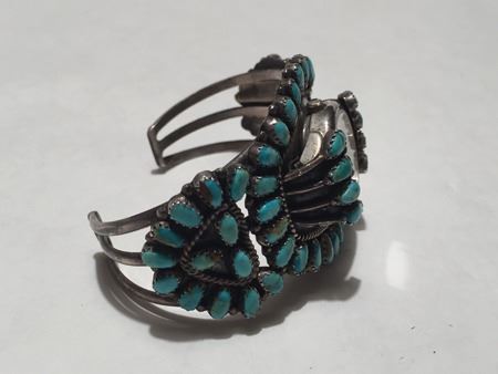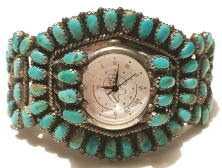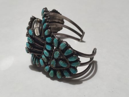 Mid 1900s, Classic turquoise and silver watch bracelet beautifully set in cluster motif; hallmark LMB. 5-5/8" + 1-1/4" x 1-3/4"