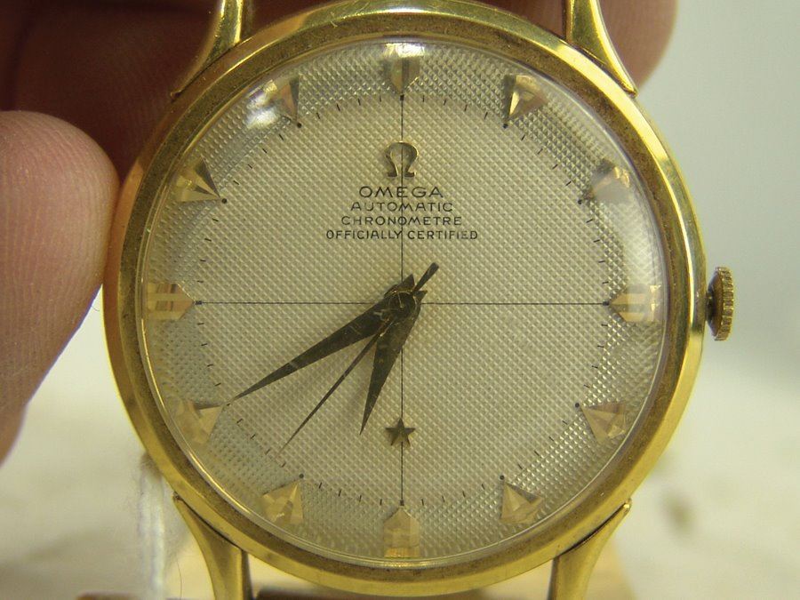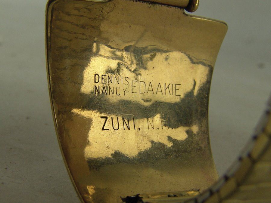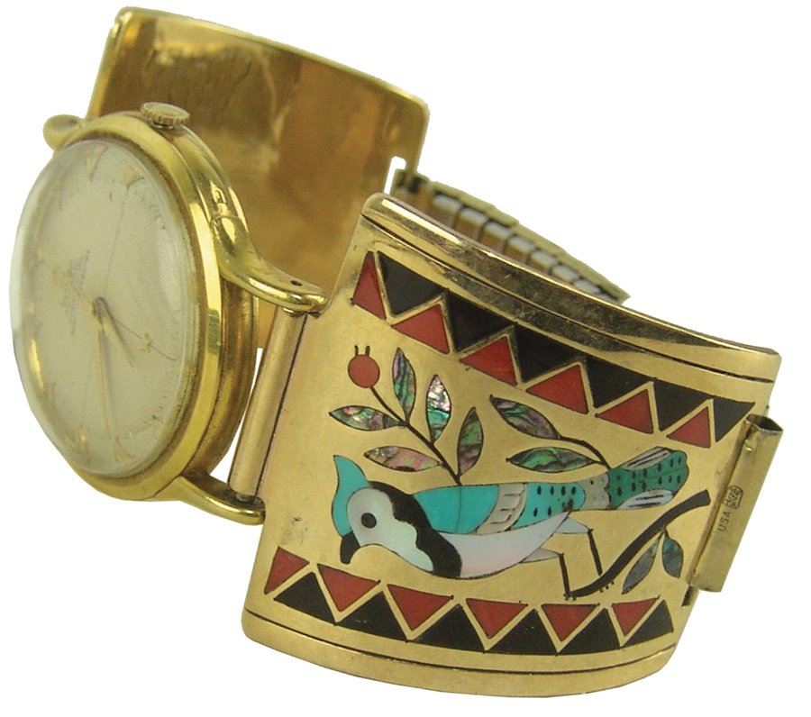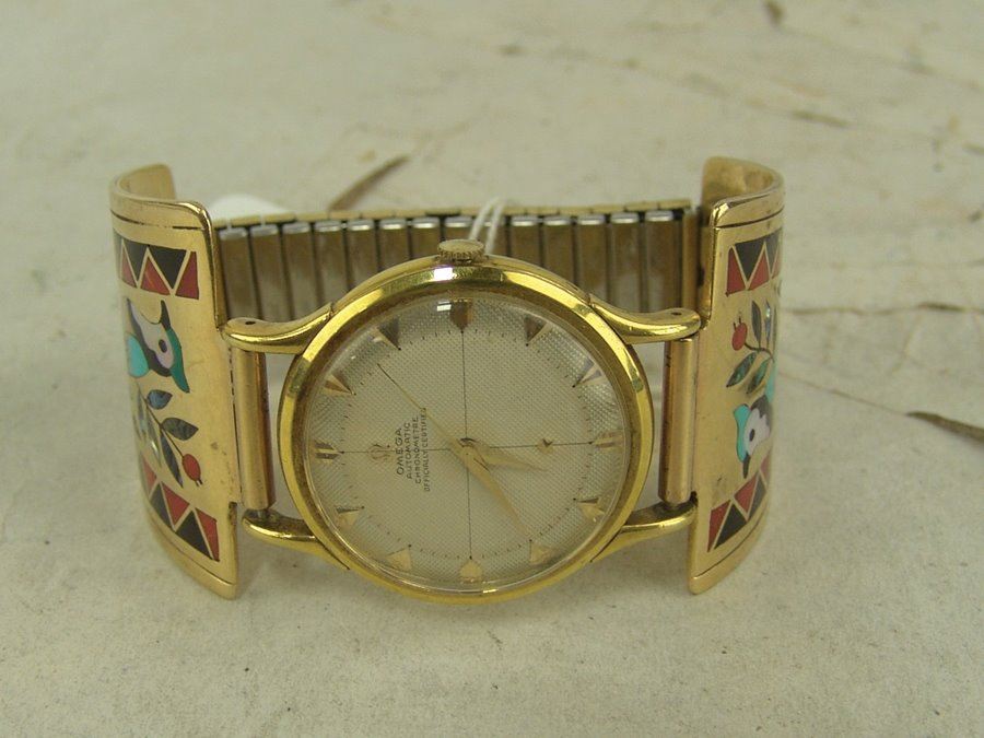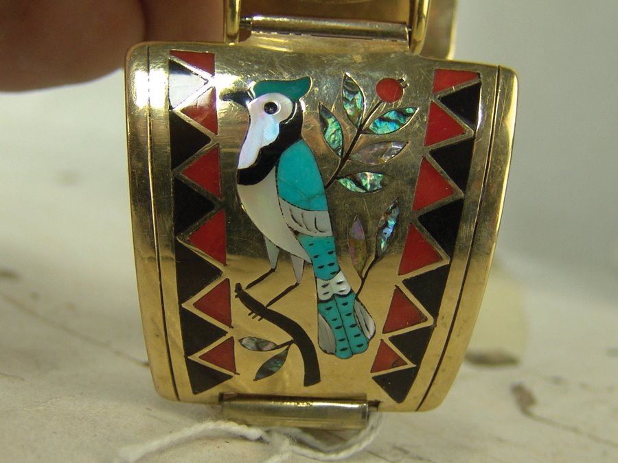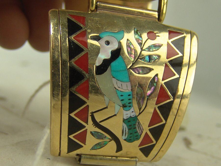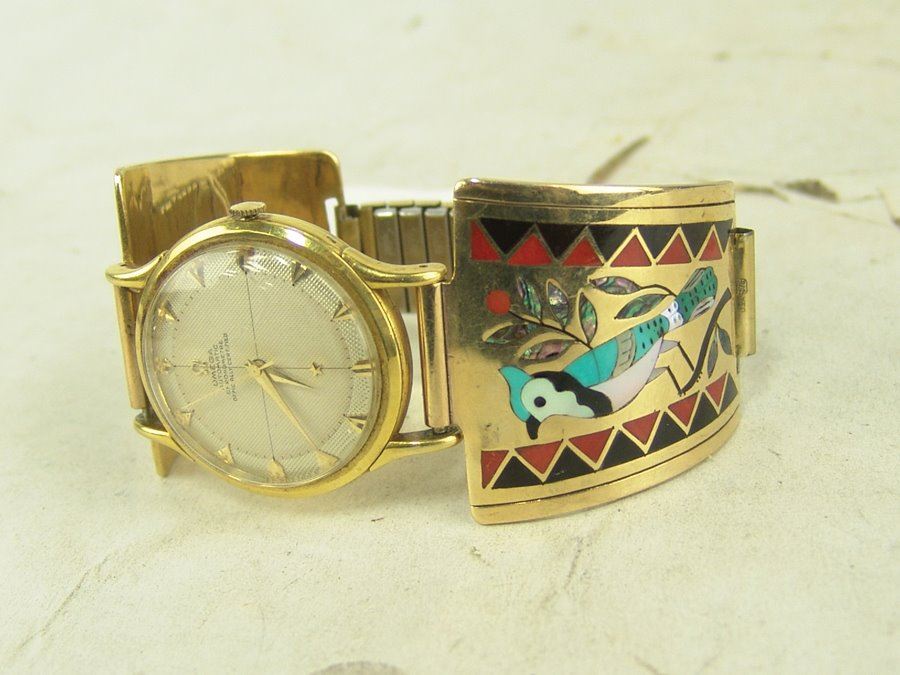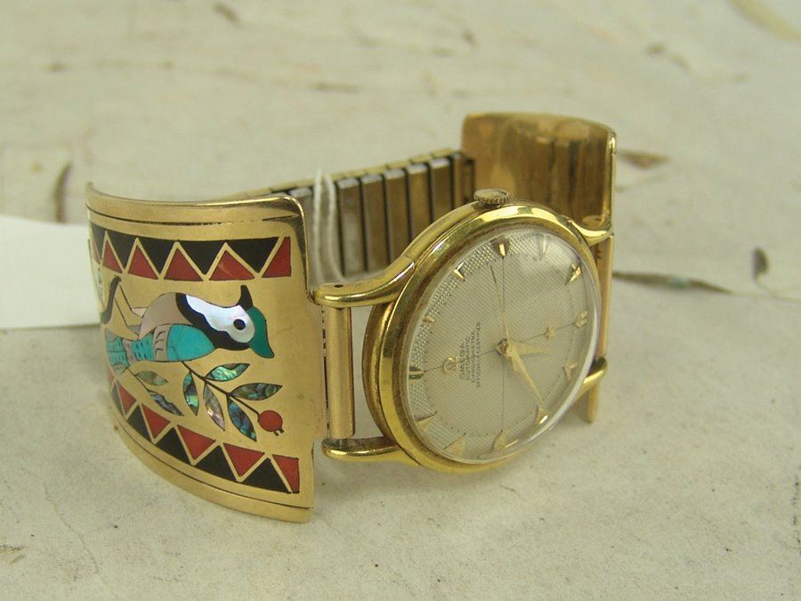 Pair of beautiful inlaid 14kt gold on silver watch tips with blue jay of turquoise, mother of pearl, jet, and coral. Includes an Omega watch (condition unknown.) Very good condition.,Ca. 1980s,Mens