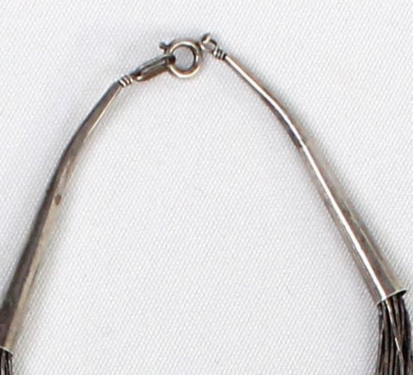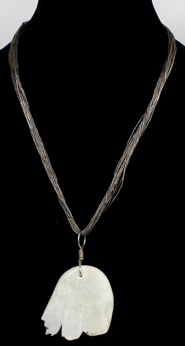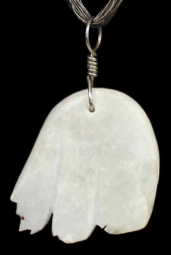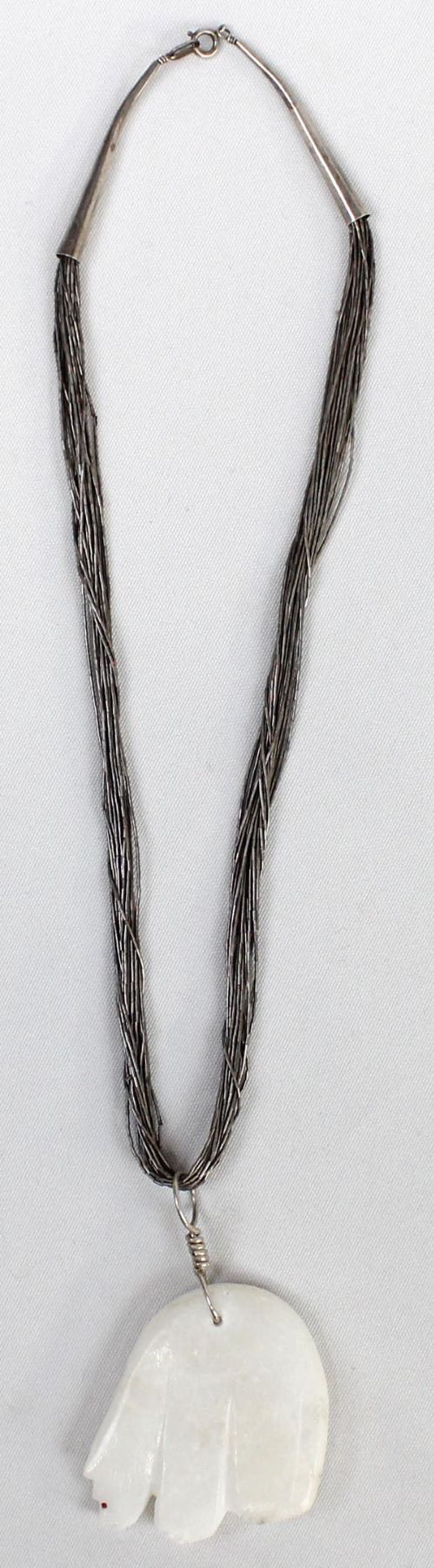 Native American Zuni White Alabaster Bear Fetish Necklace, 19 strand liquid silver necklace measures 22''L end to end, bear pendant measures 2.5'' x 2.5'', sterling cones, possible artist Everett Pino