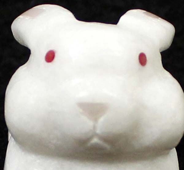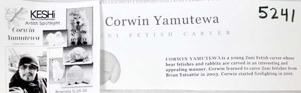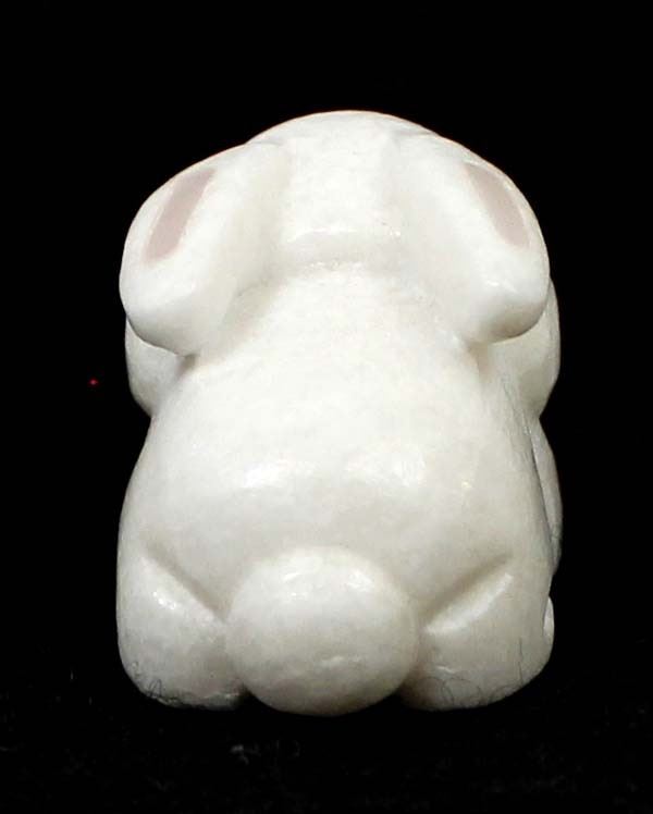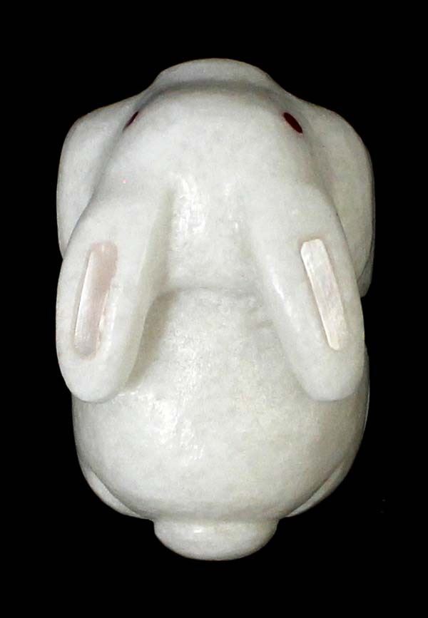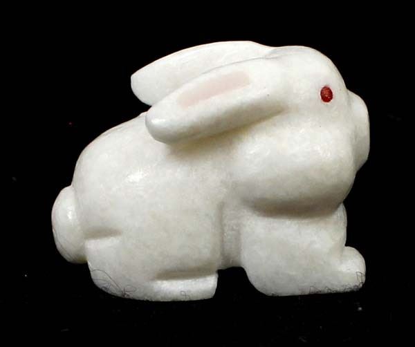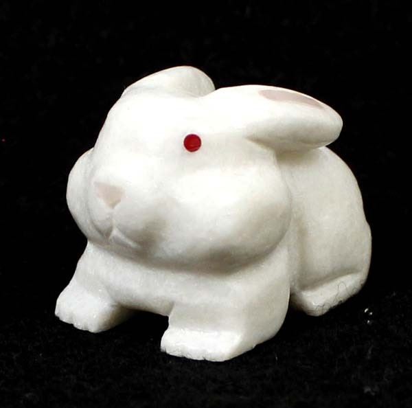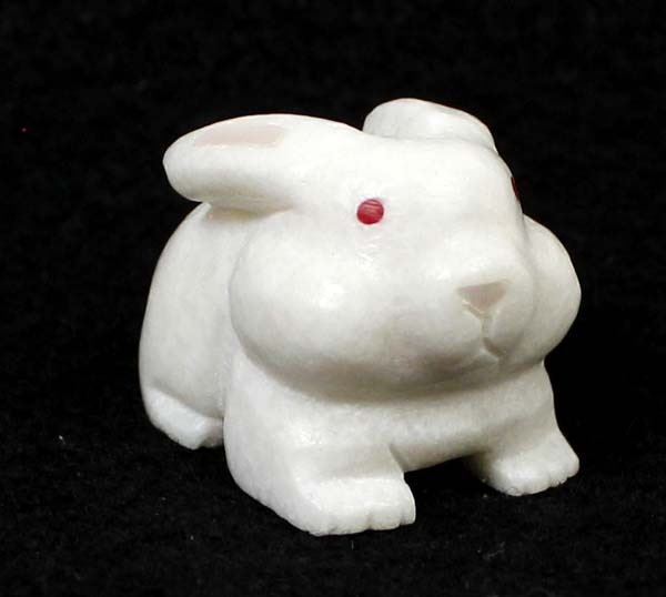 Native American Zuni White Marble Rabbit Fetish by Corwin Yamutewa, measures .75'' x 1'', has artist's initials on the bottom, coral eyes