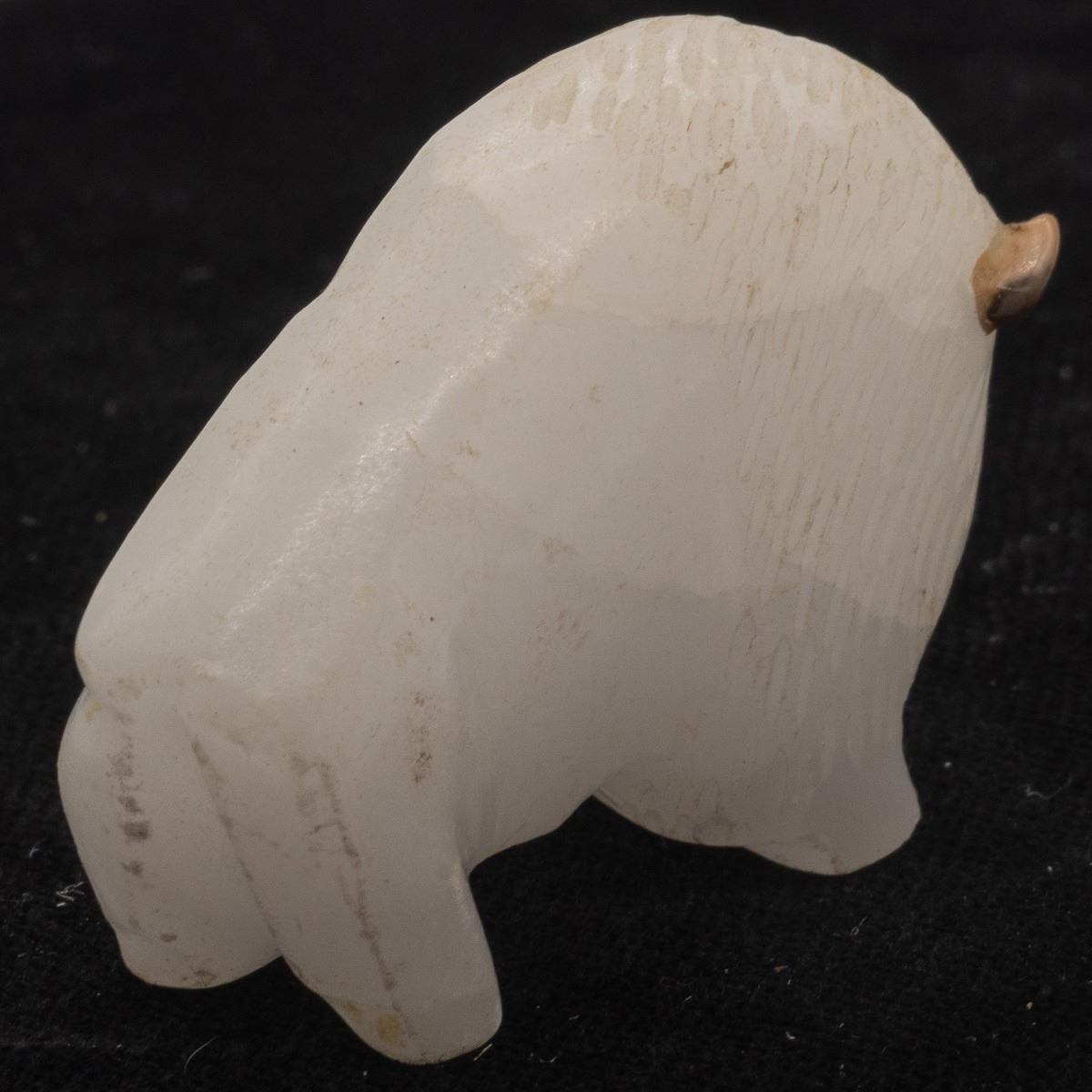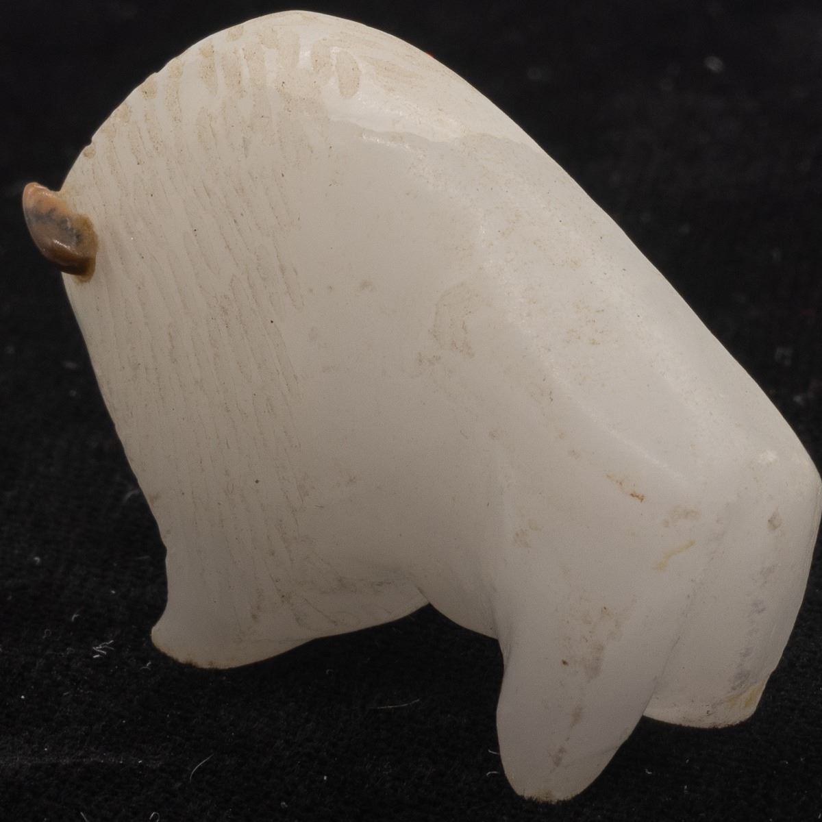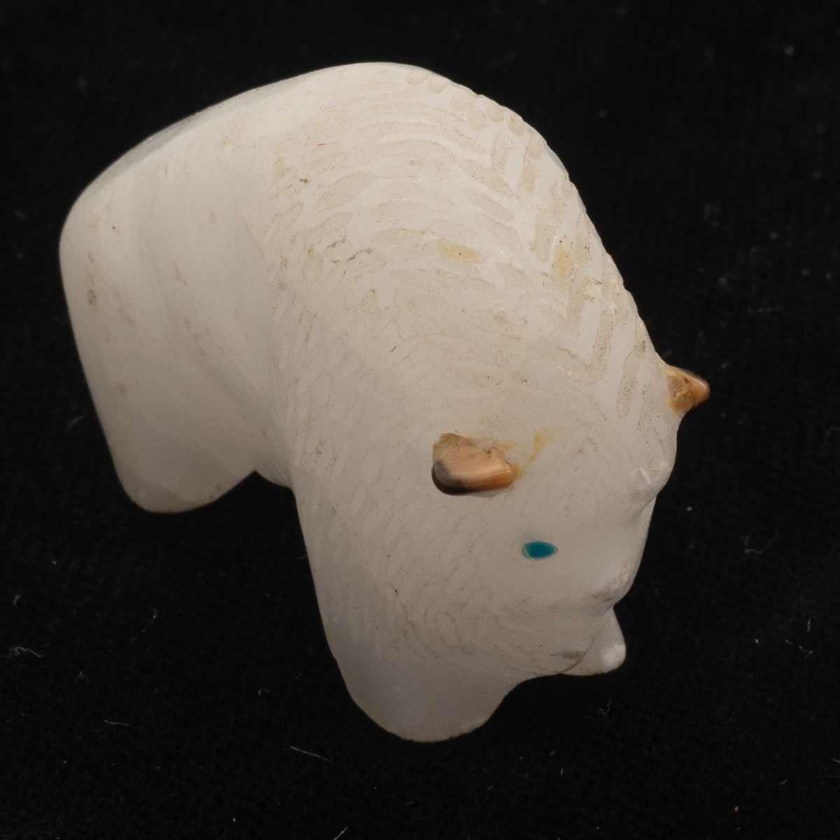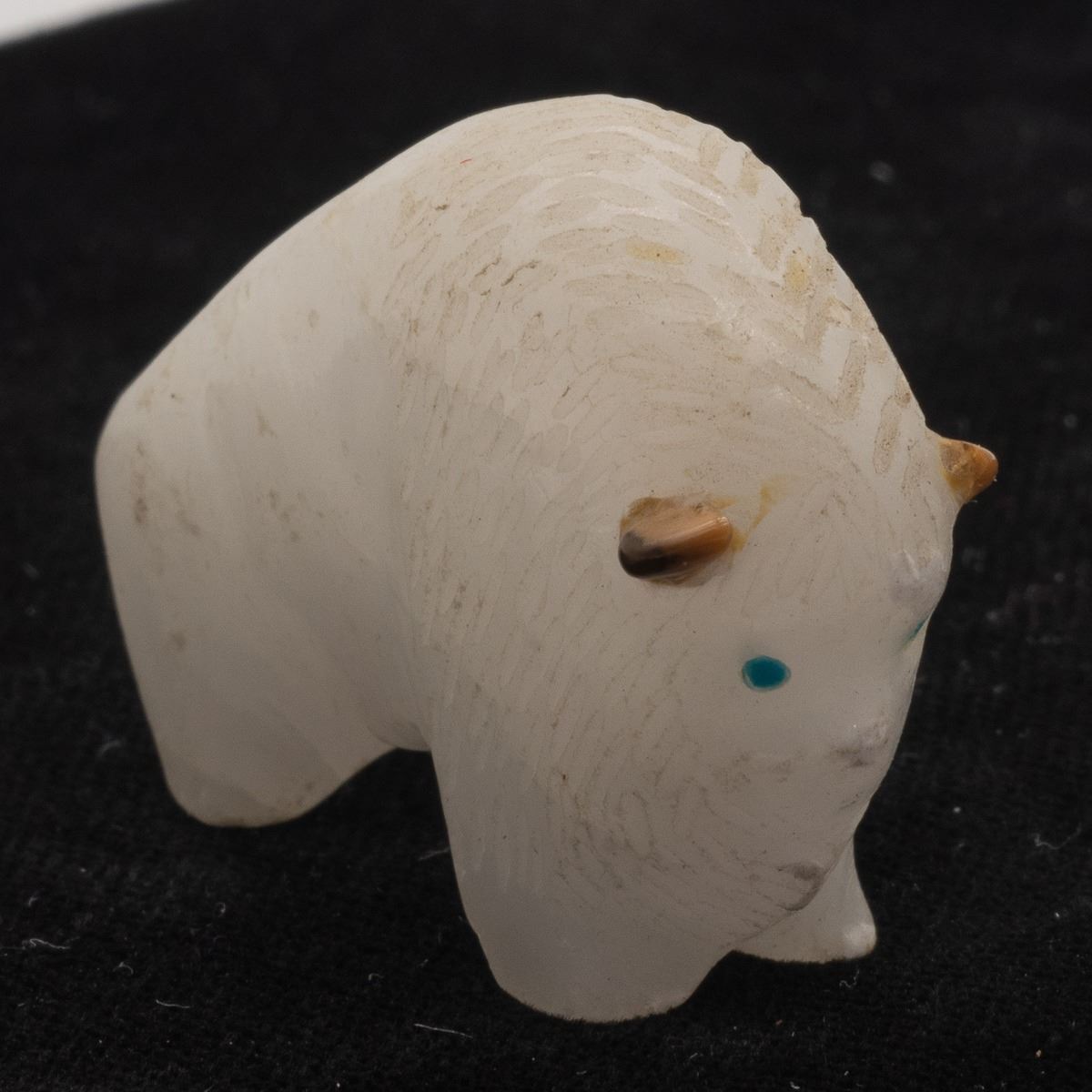 Native American Zuni White Quartz Buffalo Fetish by Lynn Quam, turquoise eyes, measures 1.75''L x 1.25''H x .5''W