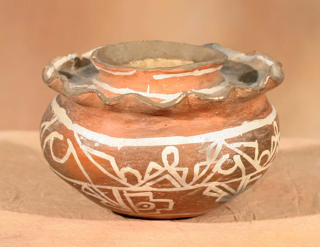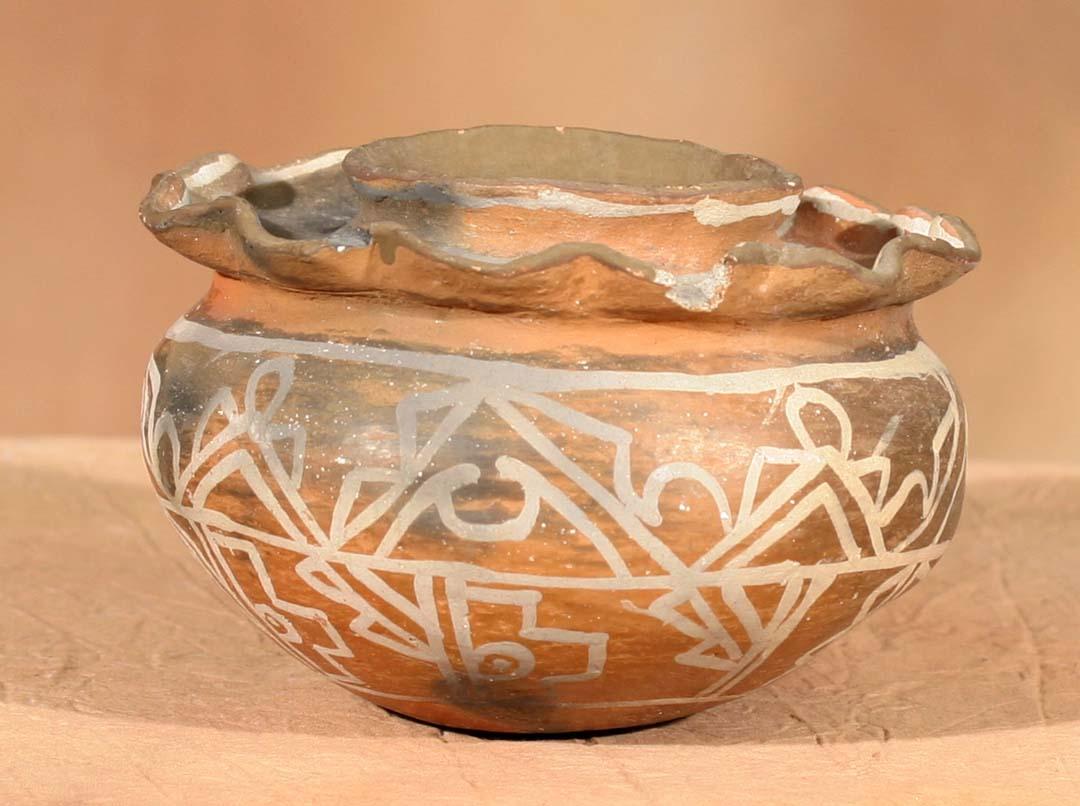Zuni White on Red Jar . 4 ½" x 6 ¾". Fluted shoulder and featuring early abstract designs. Circa 1880. (est $700-1,000). Provenance: Bethany College, Lindsborg, KS. For condition reports please visit: www.auctioninsantafe.com/cr2011.pdf