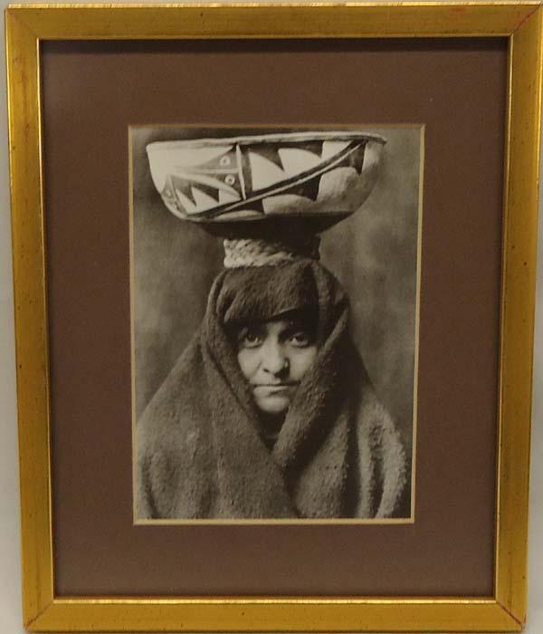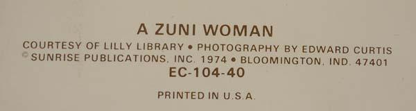 Framed Edward Curtis Photograph Print of Zuni Woman. Wood frame, non-glare glass and matting. Visual is 5''x7''. Buyers Pay Actual Shipping and Handling Charges(see terms and conditions for more information).