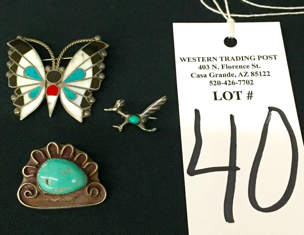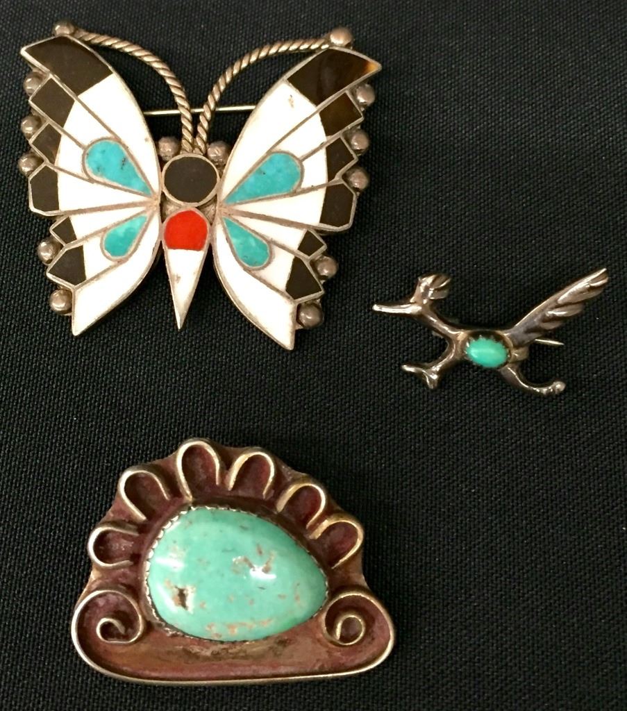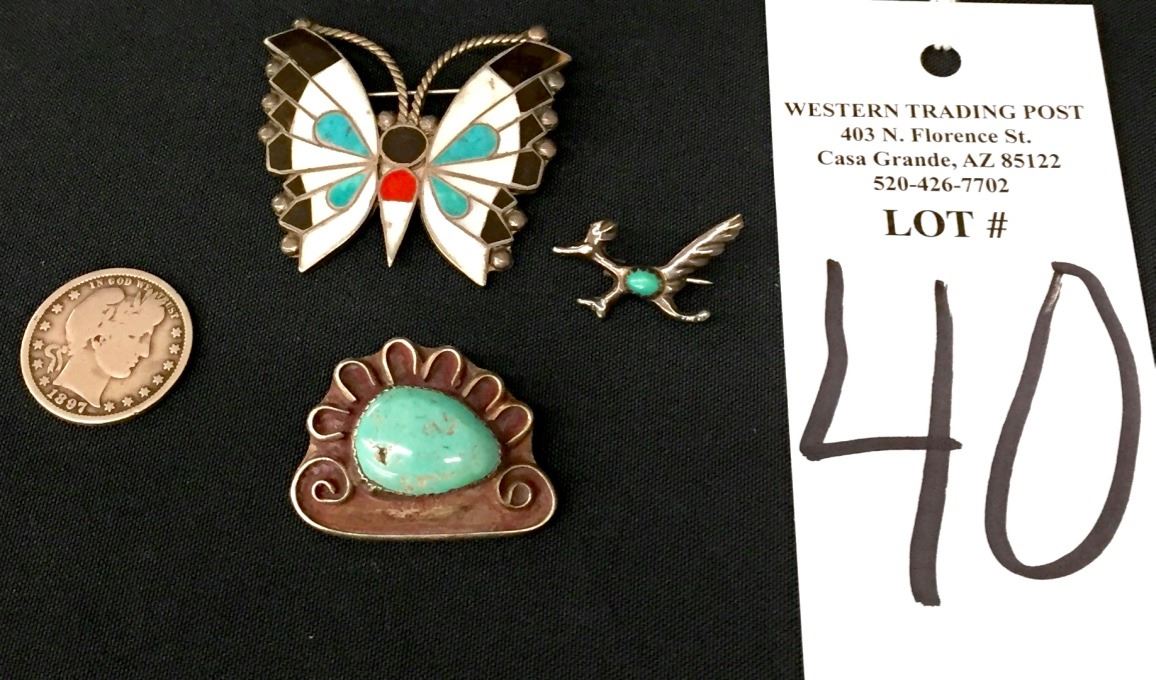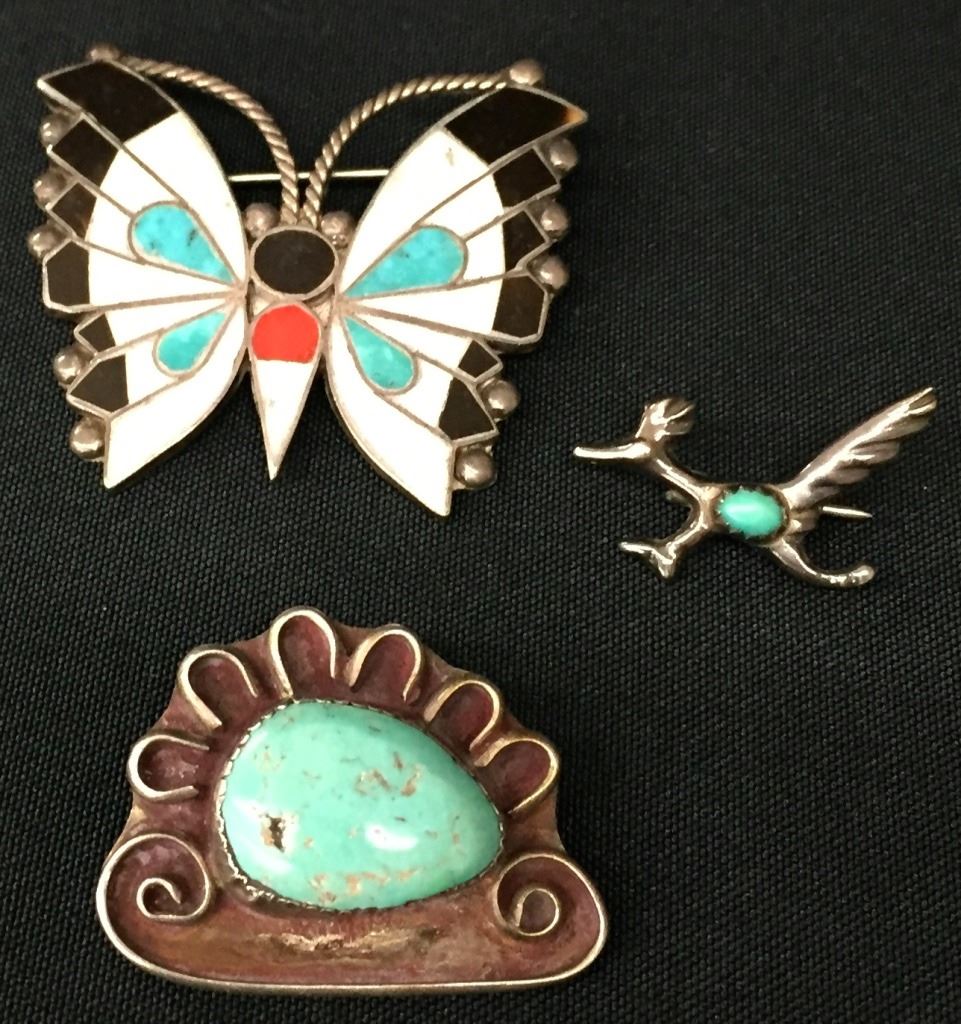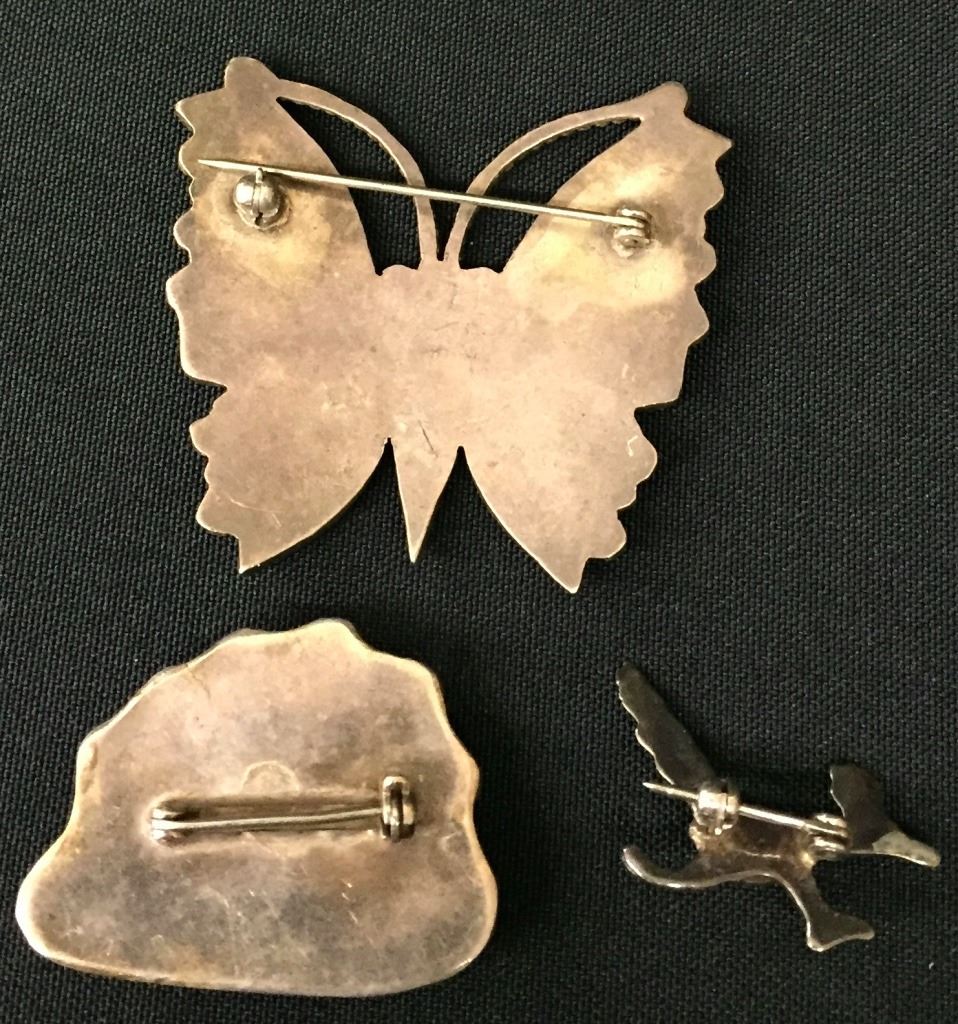 You get all 3 of these pins for 1 money. All are set in sterling. Collectively they weigh 26 g. Please look closely at the pics as they are an important part of our description. Shipping: There will be a $5 handling / packaging fee for shipping this lot. The actual cost of postage will be added on top of that.
